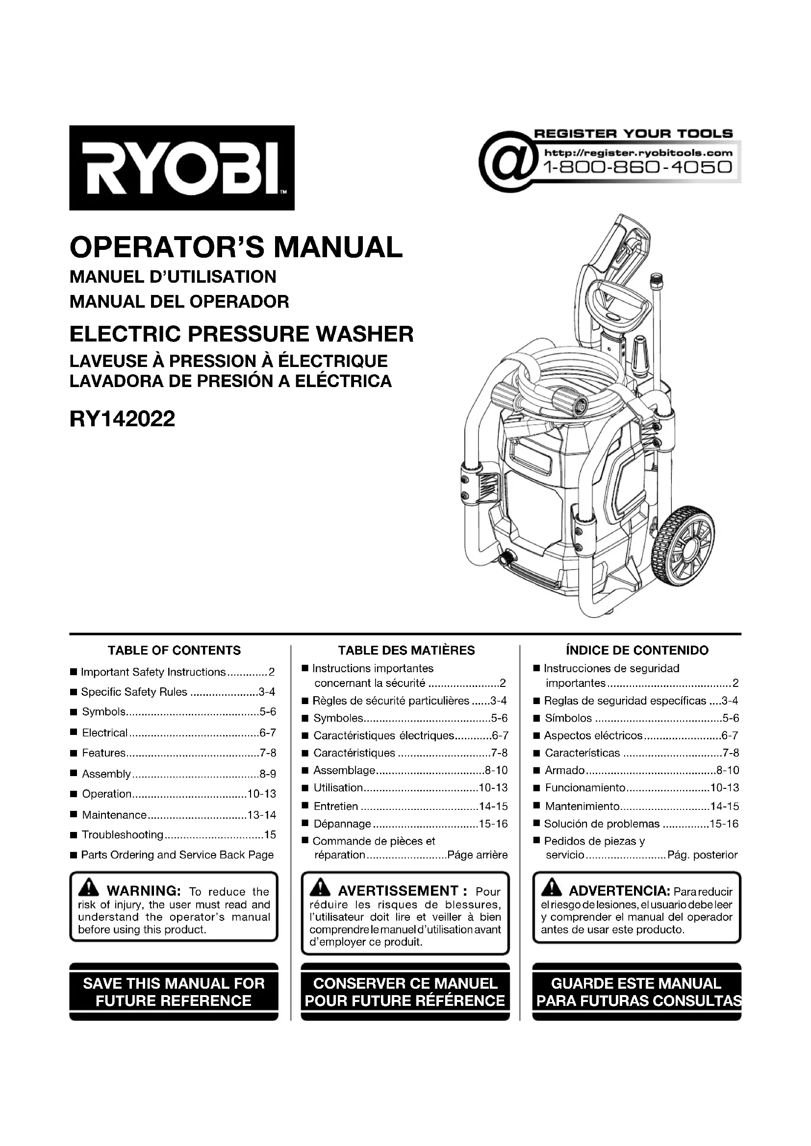 Buse incorrecte installée Remplacer la poche de détergent. Vérifier le boyau d’arrosage afin des’assurer qu’il ne comporte pas de noeuds ou de fuites et qu’il n’est pas obstrué. Installer la buse bleue ou noir à détergent. Présence de fuites dans la lance Remplacement du joint torique requis Remplacer le joint torique. Si le problème persiste, communiquer avec le centre de réparations agréé afin d’obtenir une nouvelle lance. Si le problème persiste après avoir essayé les solutions ci-dessus, communiquer avec le service à la clientèle ou un centre de réparations agréé le plus proche pour obtenir de l’aide. Ce produit est accompagné d’une garantie limitée de trois (3) ans pour utilisation personnel, familiales ou domestiques (90 jours pour utilisation affaires ou commerciaux). Pour obtenir les détails de la garantie, visiter le site www.ryobitools.com ou appeler (sans frais) au 1-800-860-4050. DÉPANNAGE2 — Español ADVERTENCIA: Lea y comprenda todas las instrucciones. El incumplimiento de las instrucciones señaladas abajo puede causar descargas eléctricas, incendios y lesions corporales serias. ADVERTENCIA: Al emplear este producto, siempre se deben respetar precauciones básicas, incluidas las siguientes: