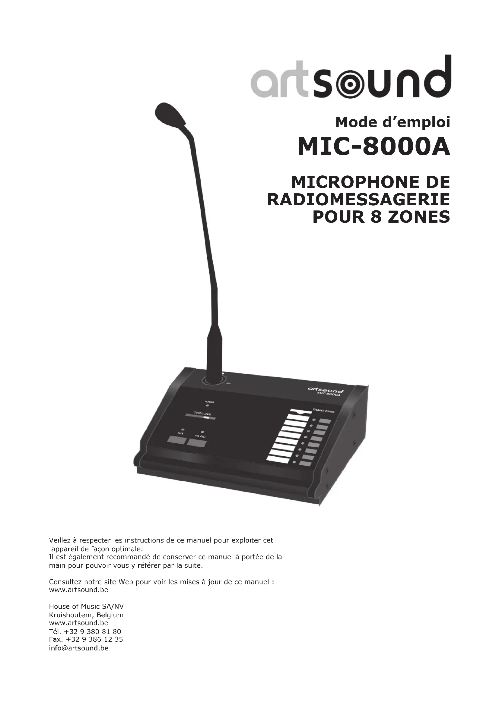 Veillez à respecter les instructions de ce manuel pour exploiter cet appareil de façon optimale. Il est également recommandé de conserver ce manuel à portée de la main pour pouvoir vous y référer par la suite. Consultez notre site Web pour voir les mises à jour de ce manuel : www.artsound.be House of Music SA/NV Kruishoutem, Belgium www.artsound.be Tél. +32 9 380 81 80 Fax. +32 9 386 12 35 info@artsound.be Mode d’emploi MIC-8000A MICROPHONE DE RADIOMESSAGERIE