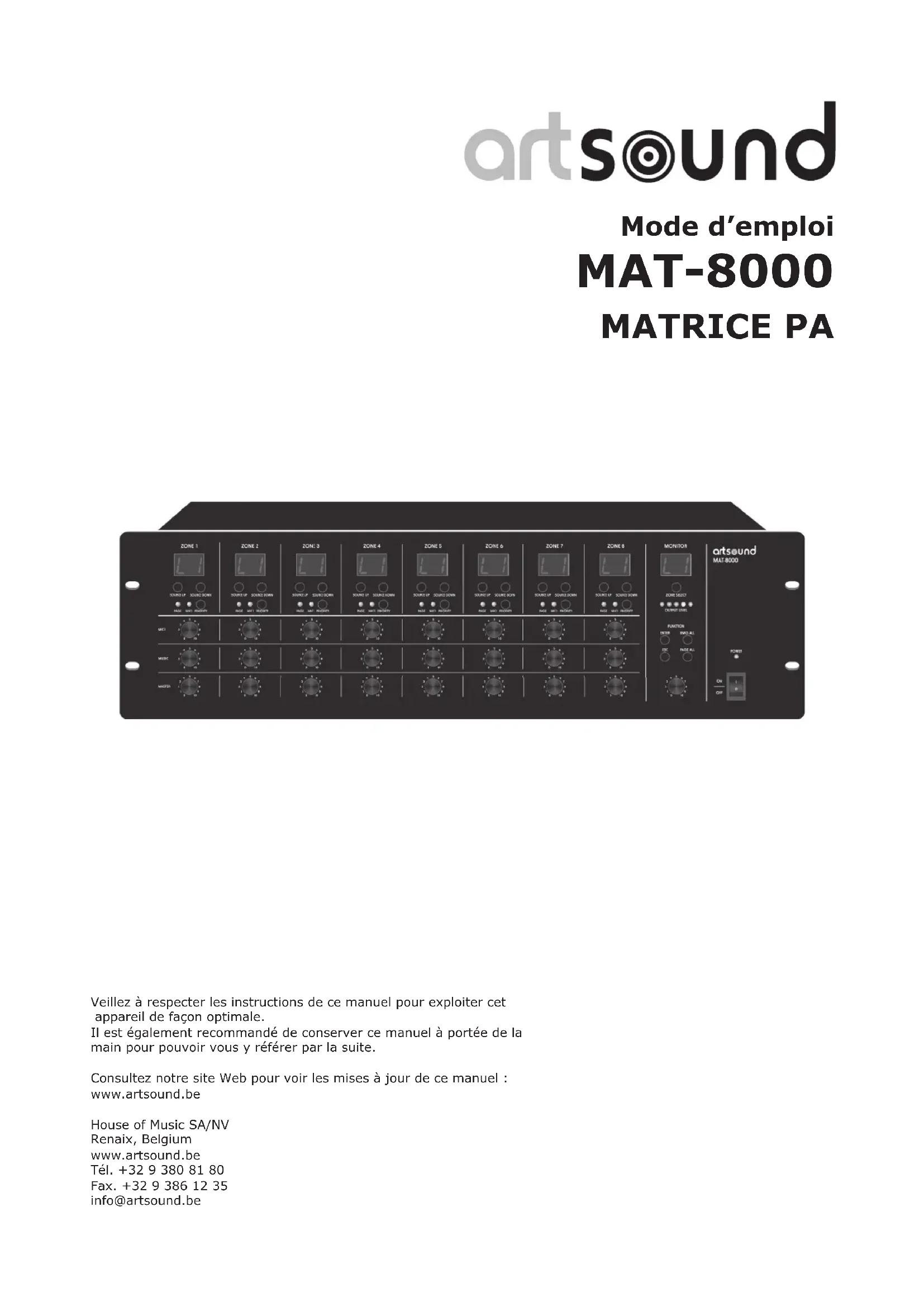 Mode d’emploi MAT-8000 MATRICE PA Veillez à respecter les instructions de ce manuel pour exploiter cet appareil de façon optimale. Il est également recommandé de conserver ce manuel à portée de la main pour pouvoir vous y référer par la suite. Consultez notre site Web pour voir les mises à jour de ce manuel : www.artsound.be House of Music SA/NV Renaix, Belgium www.artsound.be Tél. +32 9 380 81 80 Fax. +32 9 386 12 35 info@artsound.beMAT-8000