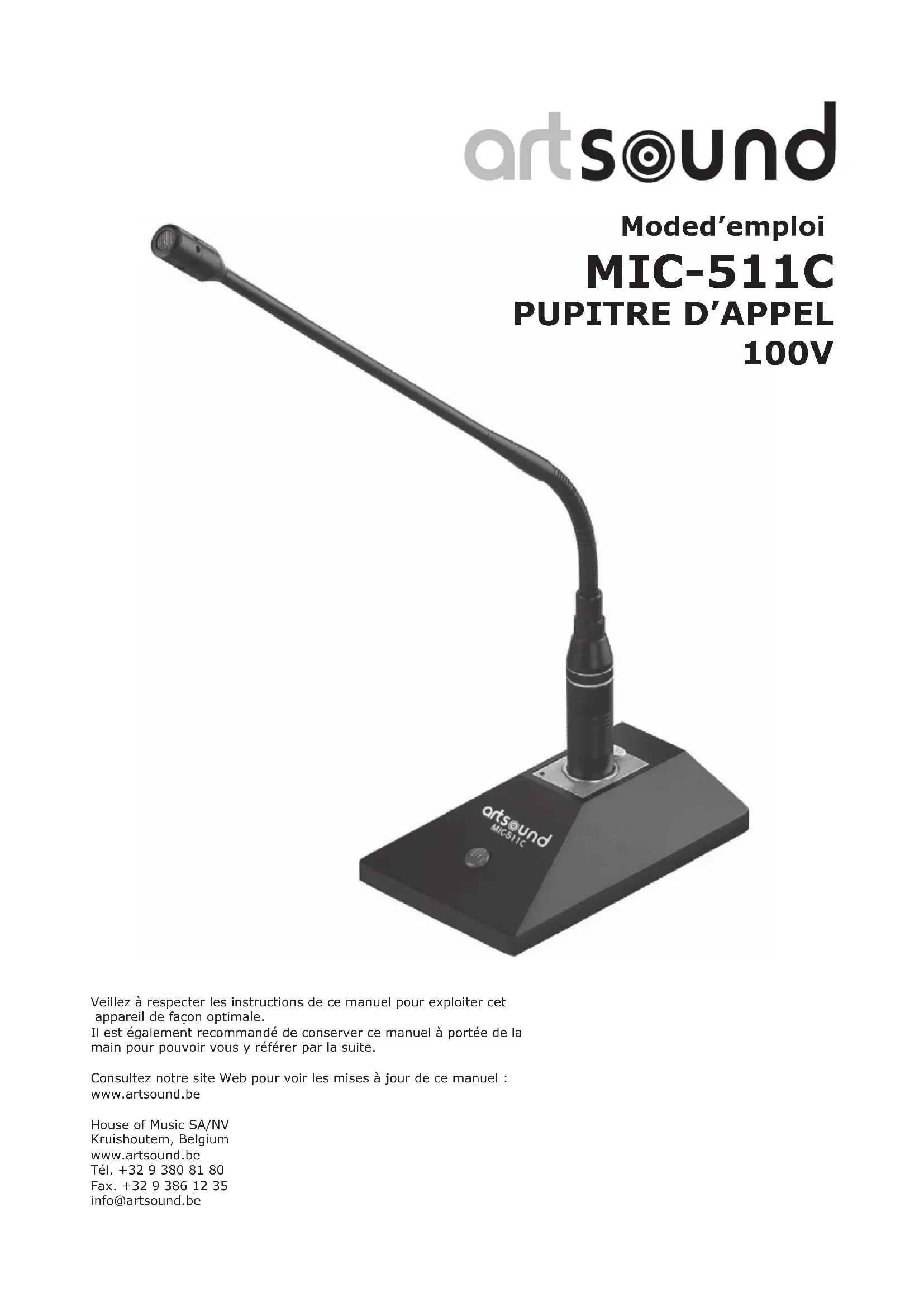 Veillez à respecter les instructions de ce manuel pour exploiter cet appareil de façon optimale. Il est également recommandé de conserver ce manuel à portée de la main pour pouvoir vous y référer par la suite. Consultez notre site Web pour voir les mises à jour de ce manuel : www.artsound.be House of Music SA/NV Kruishoutem, Belgium www.artsound.be Tél. +32 9 380 81 80 Fax. +32 9 386 12 35 info@artsound.be Mode d’emploi MIC-511C