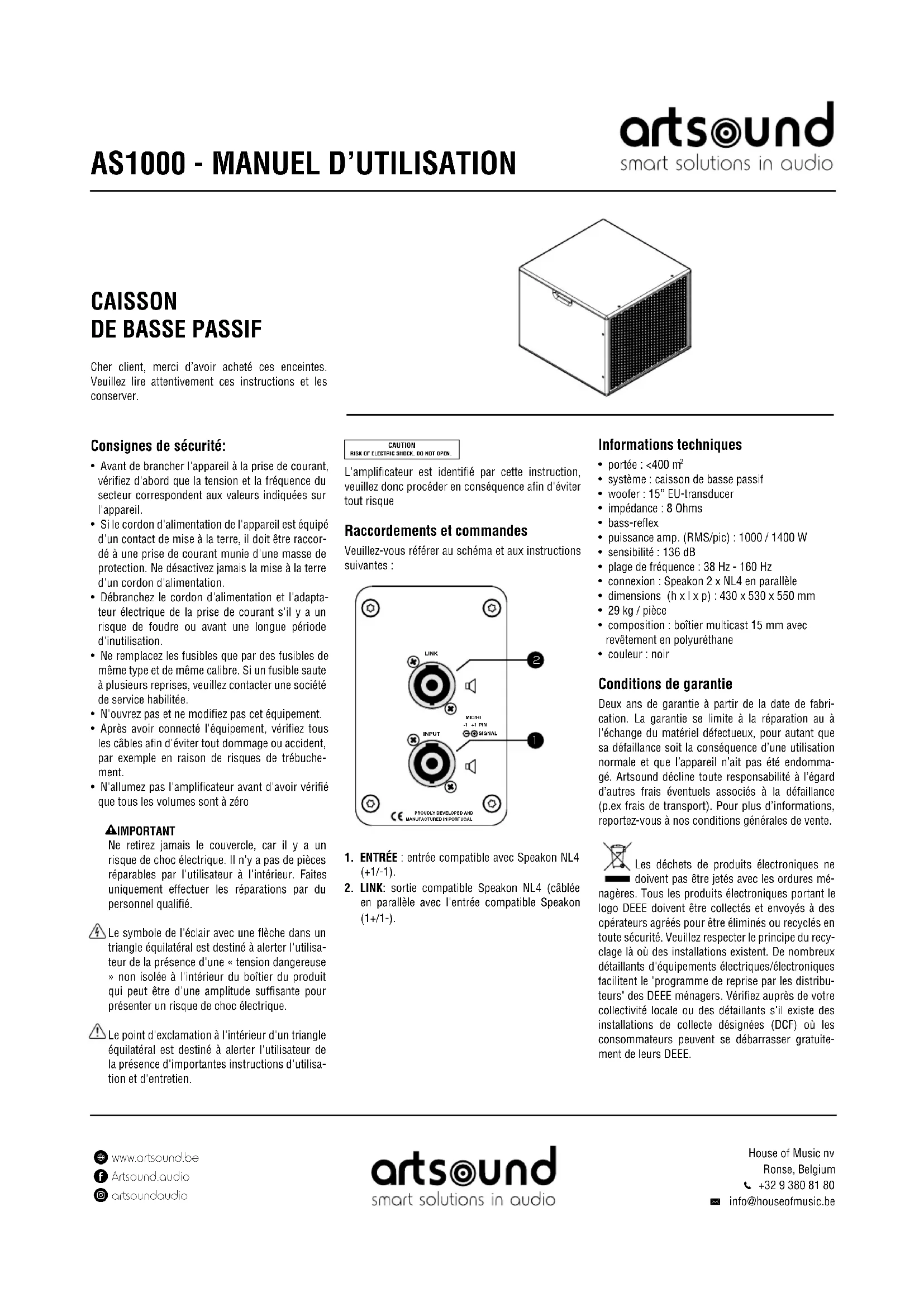- couleur : noir Conditions de garantie Deux ans de garantie à partir de la date de fabri- cation. La garantie se limite à la réparation au à l'échange du matériel défectueux, pour autant que sa défaillance soit la conséquence d’une utilisation normale et que l’appareil n’ait pas été endomma- gé. Artsound décline toute responsabilité à l’égard d’autres frais éventuels associés à la défaillance (p.ex frais de transport). Pour plus d’informations, reportez-vous à nos conditions générales de vente. Les déchets de produits électroniques ne doivent pas être jetés avec les ordures mé- nagères. Tous les produits électroniques portant le logo DEEE doivent être collectés et envoyés à des opérateurs agréés pour être éliminés ou recyclés en toute sécurité. Veuillez respecter le principe du recy- clage là où des installations existent. De nombreux détaillants d'équipements électriques/électroniques facilitent le "programme de reprise par les distribu- teurs" des DEEE ménagers. Vérifiez auprès de votre collectivité locale ou des détaillants s'il existe des installations de collecte désignées (DCF) où les consommateurs peuvent se débarrasser gratuite- ment de leurs DEEE. CAUTIONRISK OF ELECTRIC SHOCK. DO NOT OPEN.