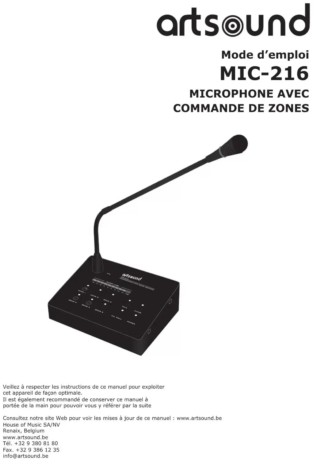 Veillez à respecter les instructions de ce manuel pour exploiter cet appareil de façon optimale. Il est également recommandé de conserver ce manuel à portée de la main pour pouvoir vous y référer par la suite Consultez notre site Web pour voir les mises à jour de ce manuel : www.artsound.be House of Music SA/NV Renaix, Belgium www.artsound.be Tél. +32 9 380 81 80 Fax. +32 9 386 12 35 info@artsound.beMIC-216