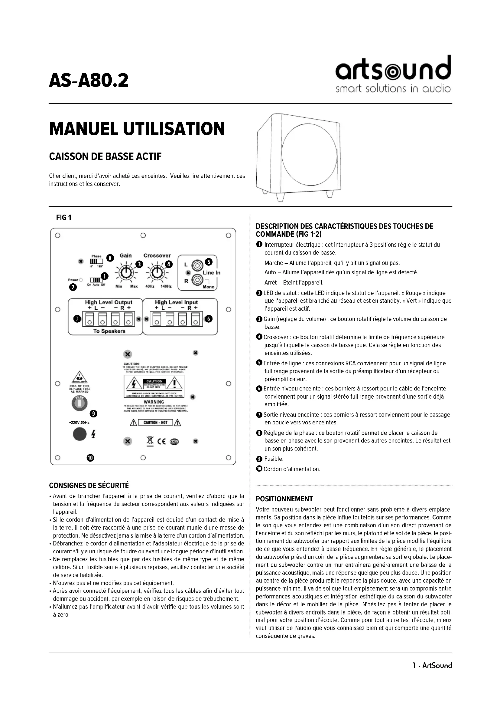 Cher client, merci d’avoir acheté ces enceintes. Veuillez lire attentivement ces instructions et les conserver. CONSIGNES DE SÉCURITÉ• Avant de brancher l'appareil à la prise de courant, vérifiez d'abord que latension et la fréquence du secteur correspondent aux valeurs indiquées sur l'appareil.• Si le cordon d'alimentation de l'appareil est équipé d'un contact de mise àla terre, il doit être raccordé à une prise de courant munie d'une masse deprotection. Ne désactivez jamais la mise à la terre d'un cordon d'alimentation.• Débranchez le cordon d'alimentation et l'adaptateur électrique de la prise de courant s'il y a un risque de foudre ou avant une longue période d'inutilisation.• Ne remplacez les fusibles que par des fusibles de même type et de mêmecalibre. Si un fusible saute à plusieurs reprises, veuillez contacter une société de service habilitée.• N'ouvrez pas et ne modifiez pas cet équipement.• Après avoir connecté l'équipement, vérifiez tous les câbles afin d'éviter toutdommage ou accident, par exemple en raison de risques de trébuchement.• N'allumez pas l'amplificateur avant d'avoir vérifié que tous les volumes sontà zéroFIG 1POSITIONNEMENTVotre nouveau subwoofer peut fonctionner sans problème à divers emplace-ments. Sa position dans la pièce influe toutefois sur ses performances. Comme le son que vous entendez est une combinaison d'un son direct provenant de l'enceinte et du son réfléchi par les murs, le plafond et le sol de la pièce, le posi-tionnement du subwoofer par rapport aux limites de la pièce modifie l'équilibre de ce que vous entendez à basse fréquence. En règle générale, le placement du subwoofer près d'un coin de la pièce augmentera sa sortie globale. Le place-ment du subwoofer contre un mur entraînera généralement une baisse de la puissance acoustique, mais une réponse quelque peu plus douce. Une position au centre de la pièce produirait la réponse la plus douce, avec une capacité en puissance minime. Il va de soi que tout emplacement sera un compromis entre performances acoustiques et intégration esthétique du caisson du subwoofer dans le décor et le mobilier de la pièce. N'hésitez pas à tenter de placer le subwoofer à divers endroits dans la pièce, de façon à obtenir un résultat opti-mal pour votre position d'écoute. Comme pour tout autre test d'écoute, mieux vaut utiliser de l'audio que vous connaissez bien et qui comporte une quantité conséquente de graves.CONDITIONS DE GARANTIE Deux ans de garantie à partir de la date de fabrication. La garantie se limite à la réparation au à l'échange du matériel défectueux, pour autant que sa défail-lance soit la conséquence d’une utilisation normale et que l’appareil n’ait pas été endommagé. Artsound décline toute responsabilité à l’égard d’autres frais éventuels associés à la défaillance (p.ex frais de transport). Pour plus d’informa-tions, reportez-vous à nos conditions générales de vente.Les déchets de produits électroniques ne doivent pas être jetés avec les ordures ménagères. Tous les produits électroniques portant le logo DEEE doivent être collectés et envoyés à des opérateurs agréés pour être éli-minés ou recyclés en toute sécurité. Veuillez respecter le principe du recyclage là où des installations existent. De nombreux détaillants d'équipements élec-triques/électroniques facilitent le "programme de reprise par les distributeurs" des DEEE ménagers. Vérifiez auprès de votre collectivité locale ou des détail-lants s'il existe des installations de collecte désignées (DCF) où les consomma-teurs peuvent se débarrasser gratuitement de leurs DEEE.