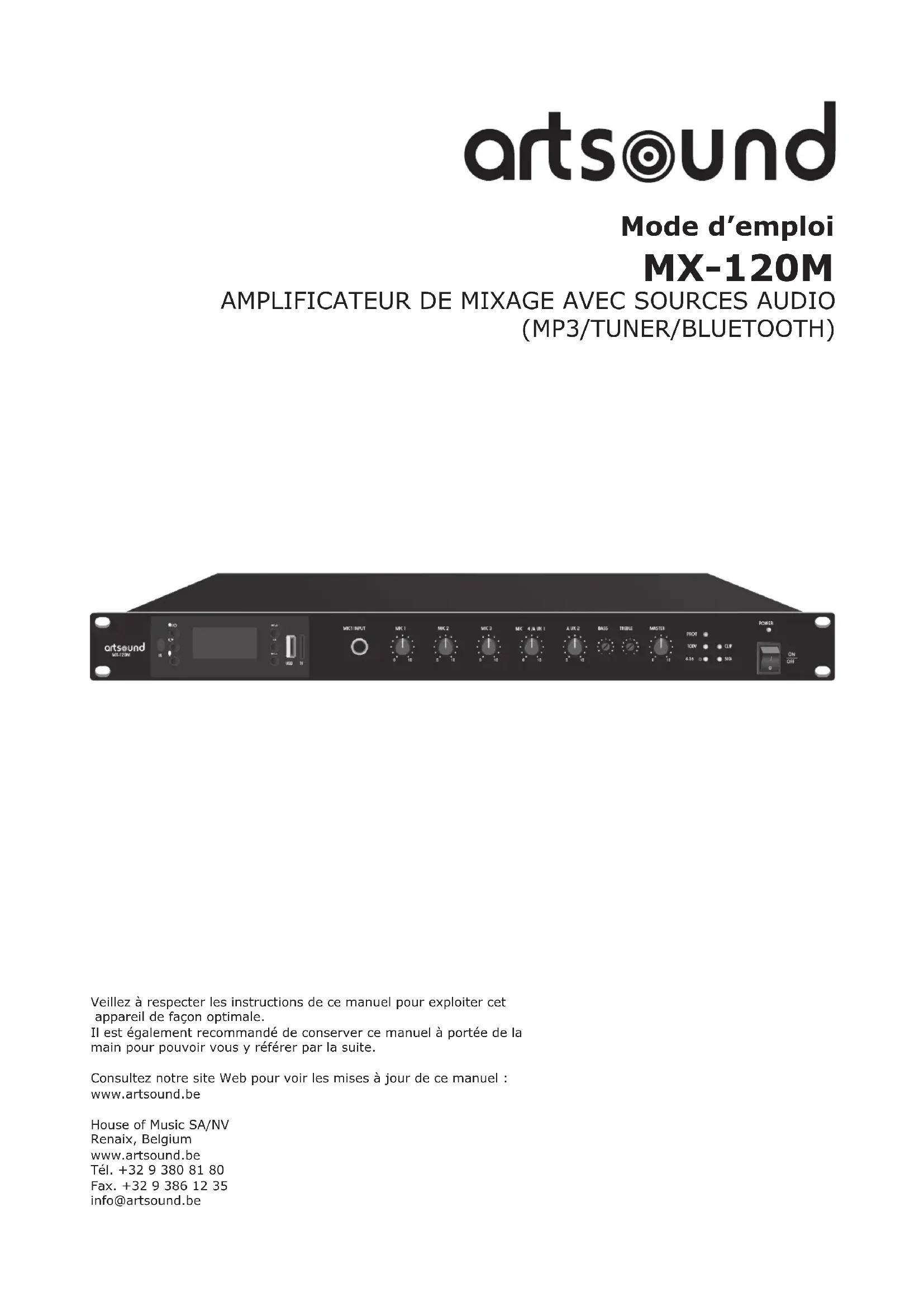 (MP3/TUNER/BLUETOOTH) Veillez à respecter les instructions de ce manuel pour exploiter cet appareil de façon optimale. Il est également recommandé de conserver ce manuel à portée de la main pour pouvoir vous y référer par la suite. Consultez notre site Web pour voir les mises à jour de ce manuel : www.artsound.be House of Music SA/NV Renaix, Belgium www.artsound.be Tél. +32 9 380 81 80 Fax. +32 9 386 12 35 info@artsound.beMX-120M