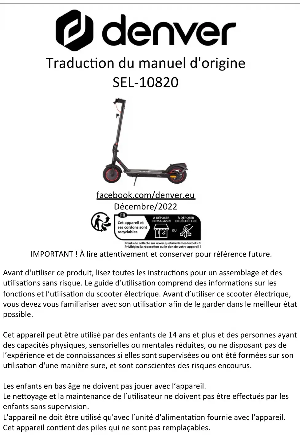 Traduction du manuel d'origine SEL-10820 facebook.com/denver.eu Décembre/2022 IMPORTANT ! À lire attentivement et conserver pour référence future. Avant d'utiliser ce produit, lisez toutes les instructions pour un assemblage et des utilisations sans risque. Le guide d’utilisation comprend des informations sur les fonctions et l’utilisation du scooter électrique. Avant d’utiliser ce scooter électrique, vous devez vous familiariser avec son utilisation afin de le garder dans le meilleur état possible. Cet appareil peut être utilisé par des enfants de 14 ans et plus et des personnes ayant des capacités physiques, sensorielles ou mentales réduites, ou ne disposant pas de l’expérience et de connaissances si elles sont supervisées ou ont été formées sur son utilisation d'une manière sure, et sont conscientes des risques encourus. Les enfants en bas âge ne doivent pas jouer avec l’appareil. Le nettoyage et la maintenance de l’utilisateur ne doivent pas être effectués par les enfants sans supervision. L'appareil ne doit être utilisé qu'avec l’unité d'alimentation fournie avec l'appareil. Cet appareil contient des piles qui ne sont pas remplaçables.2 Table des matières