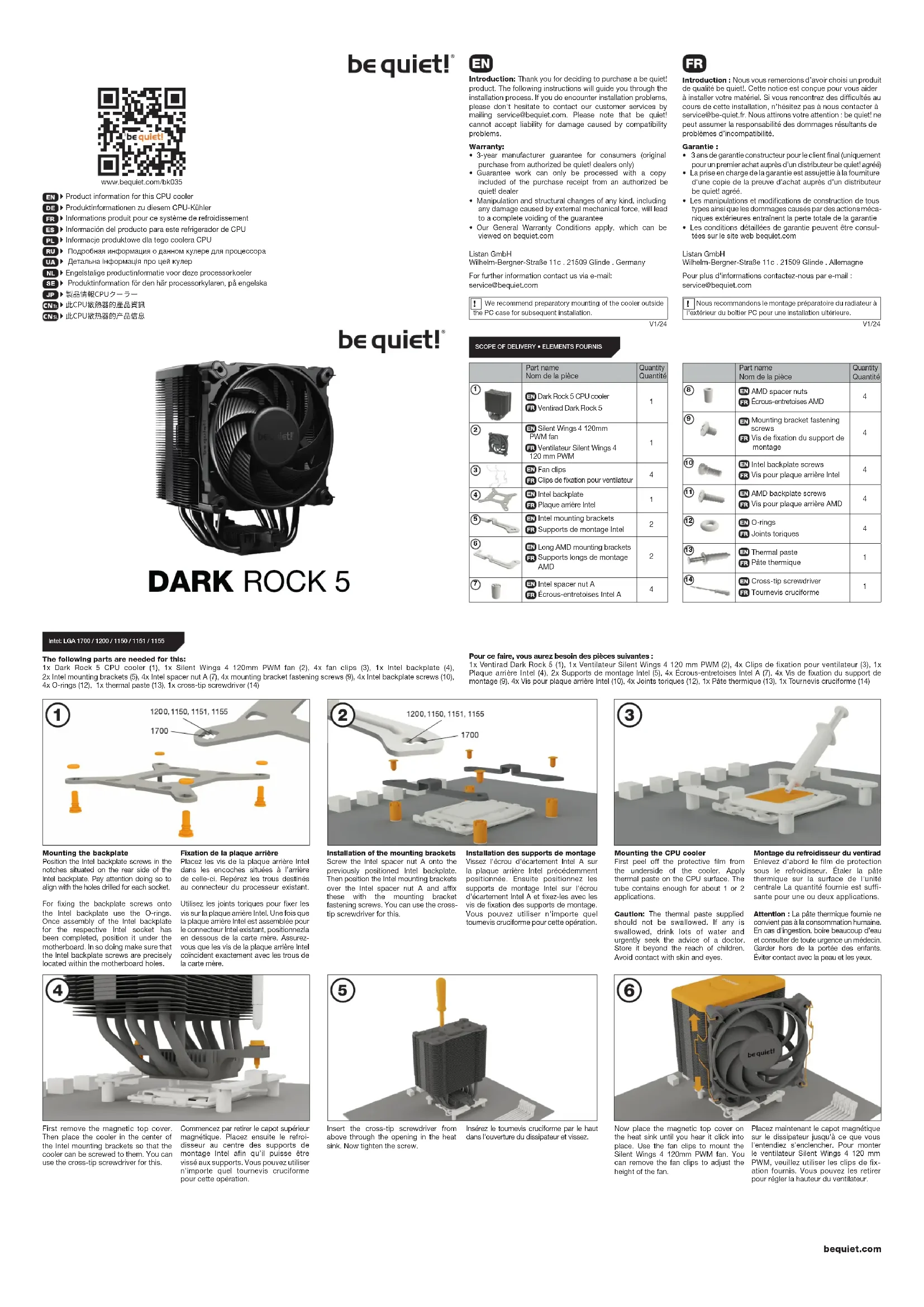 Installation of the mounting brackets Screw the Intel spacer nut A onto the previously positioned Intel backplate. Then position the Intel mounting brackets over the Intel spacer nut A and affix these with the mounting bracket fastening screws. You can use the cross- tip screwdriver for this. Insert the cross-tip screwdriver from above through the opening in the heat sink. Now tighten the screw. Installation des supports de montage Vissez l'écrou d'écartement Intel A sur la plaque arrière Intel précédemment positionnée. Ensuite positionnez les supports de montage Intel sur l'écrou d'écartement Intel A et fixez-les avec les vis de fixation des supports de montage. Vous pouvez utiliser n'importe quel tournevis cruciforme pour cette opération. Fixation de la plaque arrière Placez les vis de la plaque arrière Intel dans les encoches situées à l’arrière de celle-ci. Repérez les trous destinés au connecteur du processeur existant. Utilisez les joints toriques pour fixer les vis sur la plaque arrière Intel. Une fois que la plaque arrière Intel est assemblée pour le connecteur Intel existant, positionnezla en dessous de la carte mère. Assurez- vous que les vis de la plaque arrière Intel coïncident exactement avec les trous de la carte mère. Insérez le tournevis cruciforme par le haut dans l'ouverture du dissipateur et vissez. Mounting the CPU cooler First peel off the protective film from the underside of the cooler. Apply thermal paste on the CPU surface. The tube contains enough for about 1 or 2 applications. Caution: The thermal paste supplied should not be swallowed. If any is swallowed, drink lots of water and urgently seek the advice of a doctor. Store it beyond the reach of children. Avoid contact with skin and eyes. Montage du refroidisseur du ventirad Enlevez d'abord le film de protection sous le refroidisseur. Étaler la pâte thermique sur la surface de l'unité centrale La quantité fournie est suffi- sante pour une ou deux applications. Attention : La pâte thermique fournie ne convient pas à la consommation humaine. En cas d'ingestion, boire beaucoup d'eau et consulter de toute urgence un médecin. Garder hors de la portée des enfants. Éviter contact avec la peau et les yeux. First remove the magnetic top cover. Then place the cooler in the center of the Intel mounting brackets so that the cooler can be screwed to them. You can use the cross-tip screwdriver for this. Now place the magnetic top cover on the heat sink until you hear it click into place. Use the fan clips to mount the Silent Wings 4 120mm PWM fan. You can remove the fan clips to adjust the height of the fan. Commencez par retirer le capot supérieur magnétique. Placez ensuite le refroi- disseur au centre des supports de montage Intel afin qu’il puisse être vissé aux supports. Vous pouvez utiliser n'importe quel tournevis cruciforme pour cette opération. Placez maintenant le capot magnétique sur le dissipateur jusqu'à ce que vous l'entendiez s'enclencher. Pour monter le ventilateur Silent Wings 4 120 mm PWM, veuillez utiliser les clips de fix- ation fournis. Vous pouvez les retirer pour régler la hauteur du ventilateur. The following parts are needed for this: 1x Dark Rock 5 CPU cooler (1), 1x Silent Wings 4 120mm PWM fan (2), 4x fan clips (3), 1x Intel backplate (4), 2x Intel mounting brackets (5), 4x Intel spacer nut A (7), 4x mounting bracket fastening screws (9), 4x Intel backplate screws (10), 4x O-rings (12), 1x thermal paste (13), 1x cross-tip screwdriver (14) Pour ce faire, vous aurez besoin des pièces suivantes : 1x Ventirad Dark Rock 5 (1), 1x Ventilateur Silent Wings 4 120 mm PWM (2), 4x Clips de fixation pour ventilateur (3), 1x Plaque arrière Intel (4), 2x Supports de montage Intel (5), 4x Écrous-entretoises Intel A (7), 4x Vis de fixation du support de montage (9), 4x Vis pour plaque arrière Intel (10), 4x Joints toriques (12), 1x Pâte thermique (13), 1x Tournevis cruciforme (14) Mounting the backplate Position the Intel backplate screws in the notches situated on the rear side of the Intel backplate. Pay attention doing so to align with the holes drilled for each socket. For fixing the backplate screws onto the Intel backplate use the O-rings. Once assembly of the Intel backplate for the respective Intel socket has been completed, position it under the motherboard. In so doing make sure that the Intel backplate screws are precisely located within the motherboard holes. Intel: LGA 1700 / 1200 / 1150 / 1151 / 1155 www.bequiet.com/bk035 Introduction : Nous vous remercions d’avoir choisi un produit de qualité be quiet!. Cette notice est conçue pour vous aider à installer votre matériel. Si vous rencontrez des difficultés au cours de cette installation, n’hésitez pas à nous contacter à service@be-quiet.fr. Nous attirons votre attention : be quiet! ne peut assumer la responsabilité des dommages résultants de problèmes d’incompatibilité. Garantie :