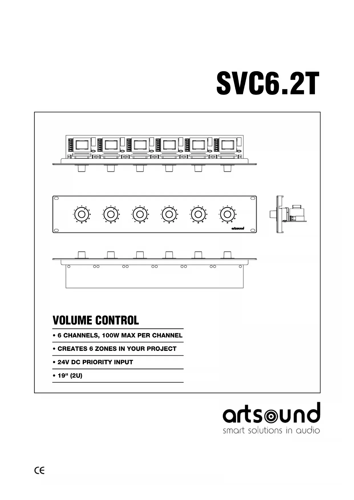 luidsprekervermogen per kanaal. TYPE LUIDSPREKERKABEL Wij raden het gebruik van een soepele kabel met een dikte van 0,75 mm – 1,5 mm aan. INTERFERENTIES VOORKOMEN Houd bij het aanbrengen van de kabels de SVC6.2T een paar cm weg van reeds aanwezige kabels (bv elek- triciteit). Cher Client, Merci d'avoir acheté ce produit ArtSound. Veuillez lire attentivement ces instructions et les conserver. INTRODUCTION Le SVC6.2T relié à un amplificateur 100V, permet de créer 6 zones différentes de volume (100W maxi- mum par canal). Les boutons en façade permettent de régler séparément ou d'éteindre complètement le volume de chaque zone. Chaque canal possède de son propre relai de rétablissement de niveau (24V DC). L'appareil est prévu pour s’intégrer dans un rack 19'. INSTALLATION AMPLIFICATION Le SVC6.2T a été conçu pour être utilisé avec un ampli- ficateur 100V. La puissance nominale maximale est de 100W par atténuateur. IMPORTANT Ne branchez pas le SVC6.2T sur un amplificateur à basse impédance. UTILISATION
