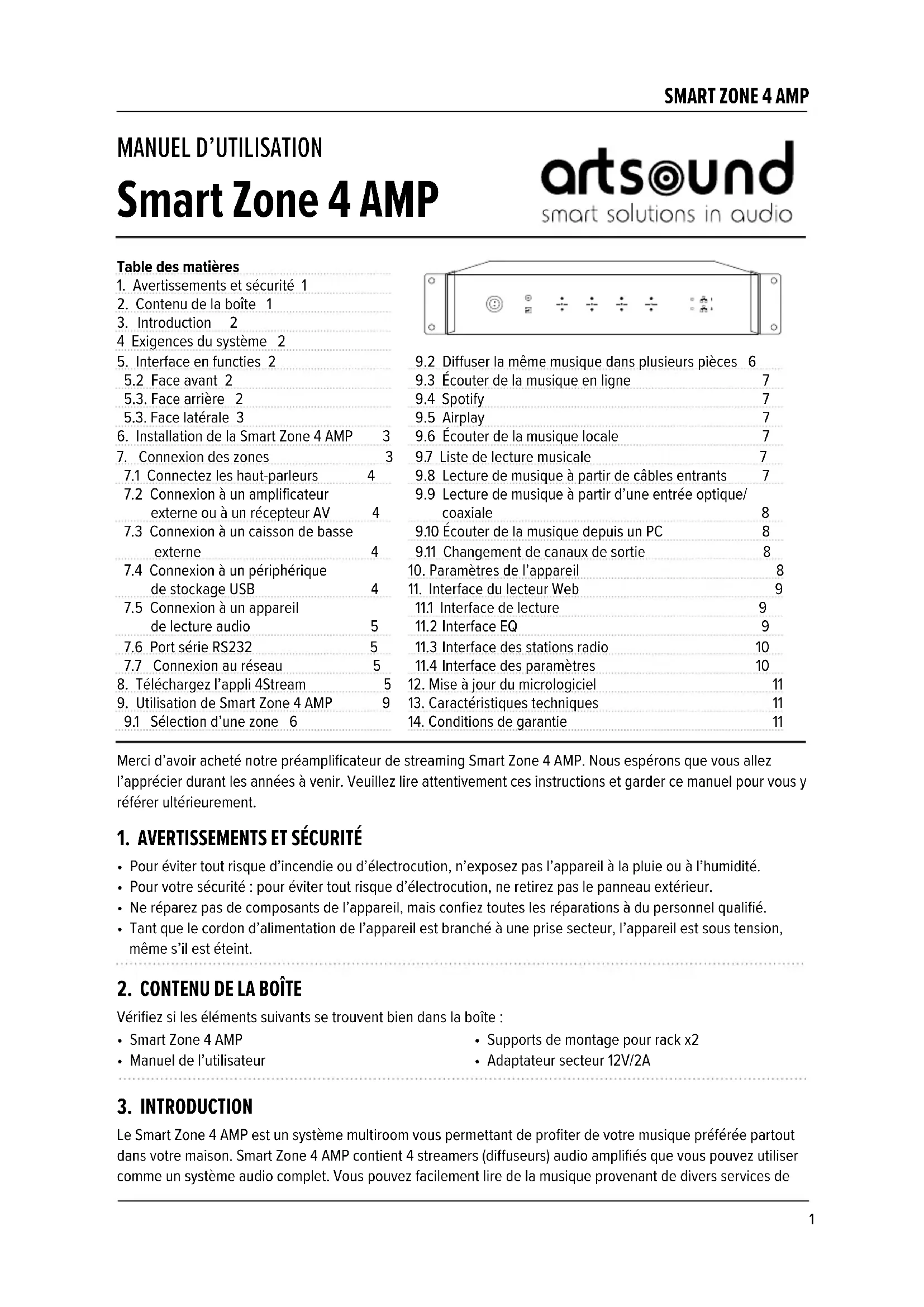 Deux ans de garantie à partir de la date d’achat. La garantie se limite à la réparation ou à l’échange du matériel défectueux, pour autant que sa défaillance soit la conséquence d’une utilisation normale et que l’appareil n’ait pas été endommagé. Artsound décline toute responsabilité à l’égard d’autres frais éventuels associés à la défail- lance (p.ex. frais de transport). Pour plus d’informations, reportez-vous à nos conditions générales de vente. regrouper des zones, 8 zones sont recommandées et 12 zones sont le maximum. Q : Quelle distance votre système audio sans fil peut-il couvrir ? A : Une fois que le système est connecté à votre routeur WiFi, vous pouvez diuser votre musique partout où il y a un signal WiFi. Q : Peut-il lire de la musique en haute résolution ? A : Oui. Nos appareils peuvent lire les formats APE et FLAC dans la plage de débit binaire normale. Ils prennent également en charge le décodage des fichiers musicaux en 24 bits/192 kHz. Q : Combien de langues sont prises en charge ? A : Nos appareils détectent automatiquement la langue de votre appareil mobile et changent automatiquement. Actuellement, nous prenons en charge l’anglais, le français, l’allemand, l’espagnol, le chinois, le portugais, le coréen et le japonais, et d’autres langues seront bientôt disponibles. Q : Quels sont les services de musique en ligne que vous prenez en charge ? A : Spotify, Deezer, Tidal, Qobuz, Amazon Music, Napster, TuneIn radio, internet radio (vTuner), iHeartRadio. Q : Puis-je diuser de la musique locale ? A : Oui. Vous pouvez lire la musique de « MA MUSIQUE » sur l’application à partir de périphériques de stockage locaux tels que comme les périphériques de stockage mobiles, les clés USB et les NAS. Q : L’appareil peut-il fonctionner avec des appareils Windows ? A : Les fonctions de fonctionnement de base peuvent être contrôlées avec l’interface Web. Avec un navigateur en surfant vers l’adresse IP de l’appareil. Enregistrez le signet et placez une icône sur le bureau pour un accès facile. Q : Toutes les sources de musique peuvent-elles être diusées en mode multiroom ? A : Oui, les services de musique en ligne, les entrées numériques et analogiques peuvent tous être diusés en mode multiroom.SMART ZONE 4 AMP K www.artsound.be E Artsound.audio Q artsoundaudio sa House of Music nv Ronse, Belgium
