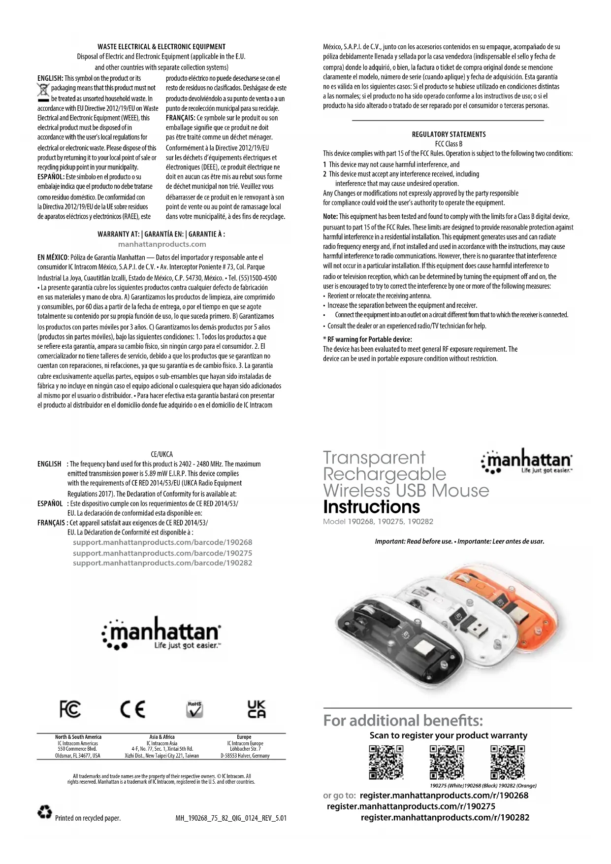 - Éteignez la souris si vous ne l’utilisez pas pendant une longue période. Vous trouvez les spécifications sur manhattanproducts.com. Enregistrez votre produit sur register.manhattanproducts. com/r/190268, register.manhattanproducts. com/r/190275, register.manhattanproducts. com/r/190282 ou scannez le code QR figurant sur la couverture. ENGLISH