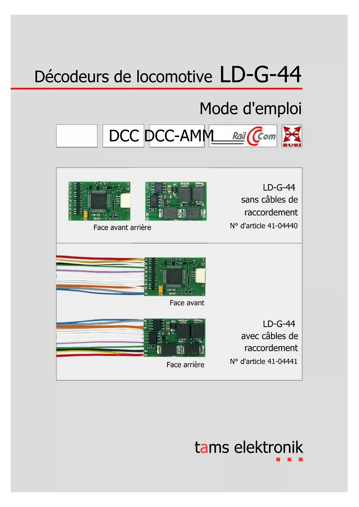tams elektronik Décodeurs de locomotive LD-G-44 Mode d'emploi Face avant arrière LD-G-44 sans câbles de raccordement N° d'article 41-04440 Face avant Face arrière LD-G-44 avec câbles de raccordement N° d'article 41-04441 tams elektronik n n n DCC DCC-AMMtams elektronik LD-G-44 tams elektronik Version 1.0 | Mise à jour : 06/2024 © Tams Elektronik GmbH Tous droits réservés, notamment le droit de reproduction et de distribution ainsi que de traduction. Les copies, reproductions et modifications sous quelque forme que ce soit nécessitent l'autorisation écrite de Tams Elektronik GmbH. Nous nous réservons le droit d'apporter des modifications techniques. Impression du mode d'emploi Le formatage est optimisé pour l'impression recto-verso. Le format standard des pages est DIN A5. Si vous préférez un affichage plus grand, il est recommandé d'imprimer sur le format DIN A4. Remarques sur les normes Les normes RailCommunity suivantes sont mentionnées dans ce manuel : RCN-217 "Protocole de retour d'information DCC – RailCom" RCN-218 "DCC-A - Inscription automatique" RCN-227 "DCC Affectation de fonction étendue" RCN-530 "Limitation du courant d'enclenchement pour décodeurs et boosters" RCN-600 "Module SUSI-Bus Interface d'extension" Les normes sont publiées sous : www.railcommunity.org Remarques concernant RailCom