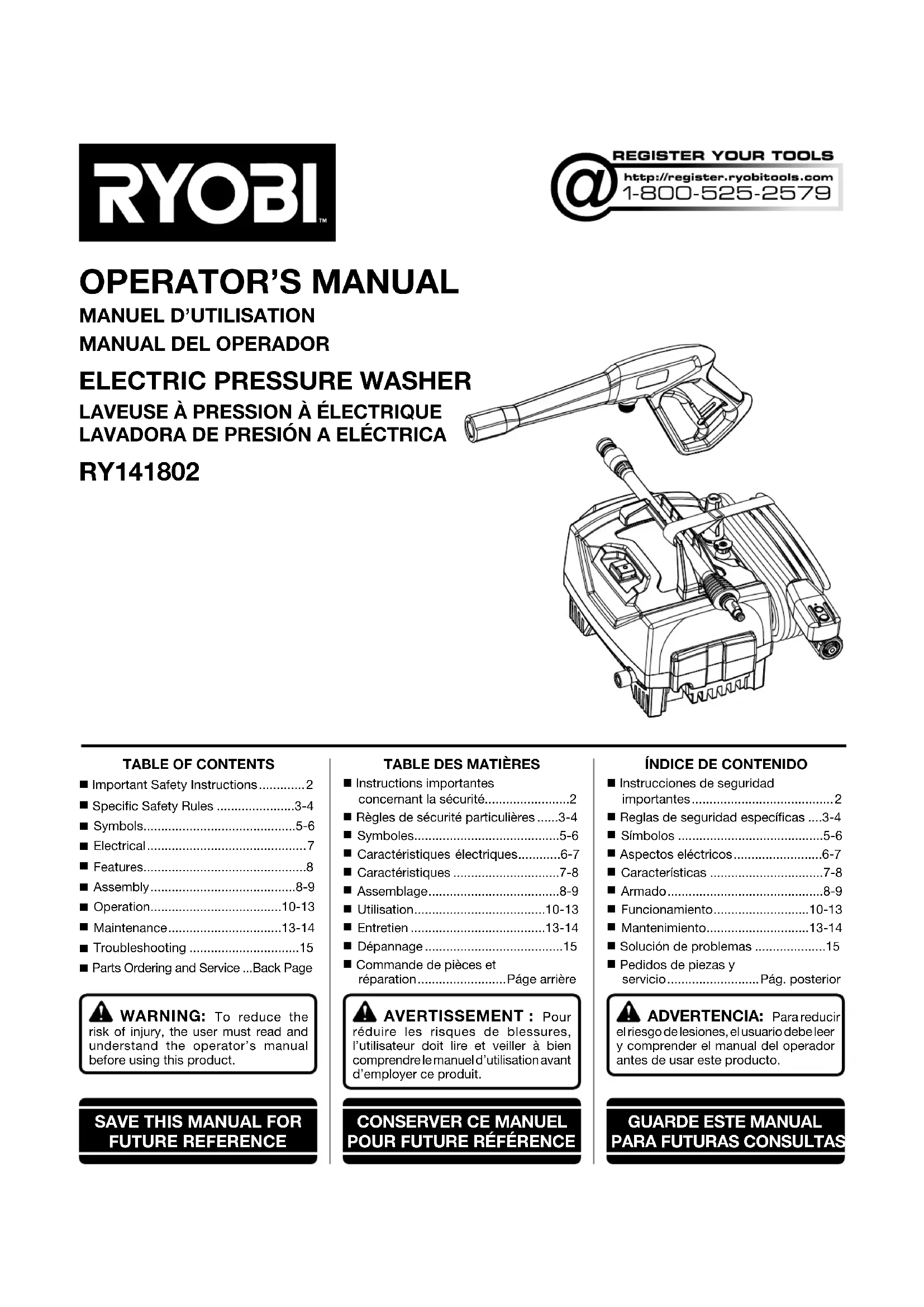 Retrouvez gratuitement la notice de l'appareil RY141802 RYOBI au format PDF.