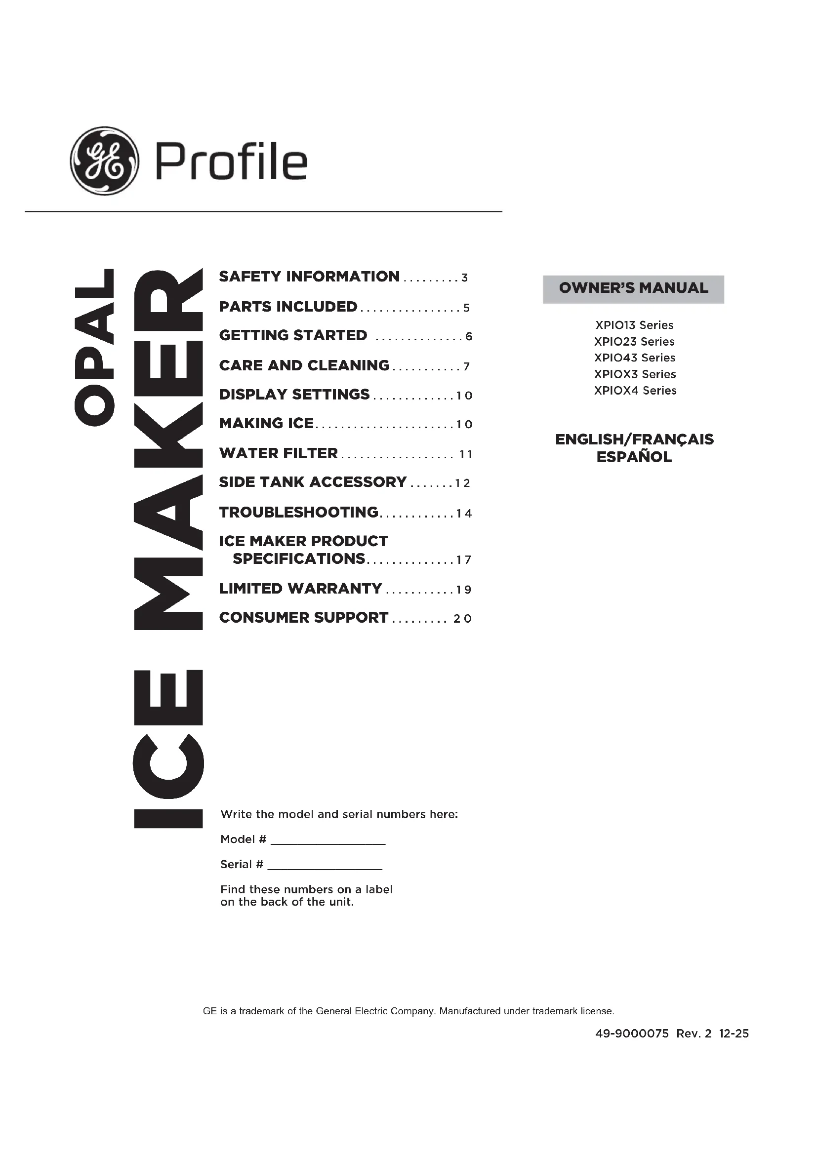 SOUTIEN AU CONSOMMATEUR .......... 20 GE est une marque de commerce de General Electric Company. Fabriqué sous licence de marque. Série XPIO13 Série XPIO23 Série XPIO43 Série XPIOX3 Série XPIOX4 FRANÇAIS2 49-9000075 Rev. 2 NOUS VOUS REMERCIONS D’INTÉGRER GE APPLIANCES À VOTRE DEMEURE. Que vous ayez grandi avec des électroménagers GE ou qu’il s’agisse de votre première acquisition, nous sommes heureux de vous accueillir dans notre famille. Nous sommes fiers du savoir-faire, de l’innovation et du design qui constituent chaque électroménager GE, et nous pensons que vous le serez aussi. Nous vous rappelons que l’enregistrement de votre électroménager vous assure de recevoir des renseignements importants sur le produit et la garantie lorsque vous en avez besoin. The Good Ice™ ™49-9000075 Rev. 2 3 ATTENTION Pour réduire le risque de blessure lors de l’utilisation de votre Opal, observez les consignes de sécurité élémentaires suivantes Ŷ 1HUHWLUH]DXFXQHpWLTXHWWHDSSRVpHVXUODPDFKLQHjJODoRQVTXLprésente des renseignements sur la sécurité, les avertissements ou le produit. Ŷ 5LVTXHDVVRFLpjXQHFKDUJHORXUGH1RXVUHFRPPDQGRQVTXHGHX[SHUVRQQHVGpSODFHQWHWLQVWDOOHQWODPDFKLQHjJODoRQVDILQGHprévenir les blessures.