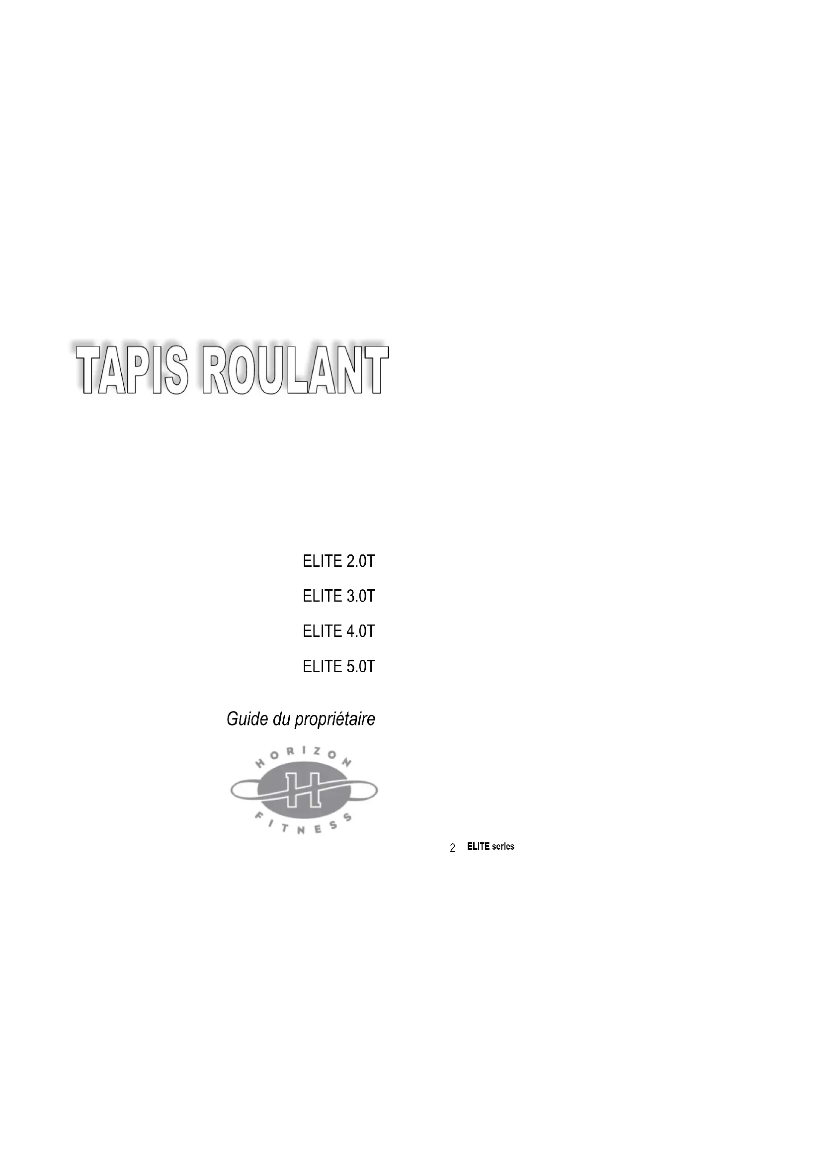 FÉLICITATIONS! pour votre achat d’un tapis roulant HORIZON FITNESS. Vous venez de franchir la première étape pour entreprendre votre nouveau programme d’entraînement. Votre tapis roulant est un outil incroyable pouvant vous aidez à atteindre les objectifs d’entraînement que vous vous êtes fixés. Une utilisation régulière vous permettra d’améliorer considérablement votre qualité de vie de différentes façons… Voici, rapidement, quelques bienfaits de l’exercice physique aérobique : Perte de poids Un cœur en santé Meilleur tonus musculaire Augmentation de l’énergie quotidienne Réduit considérablement le niveau de stress Aide à contrer l’anxiété et la dépression Amélioration de la confiance personnelle La clé pour atteindre ces bienfaits est tout simplement de développer une bonne habitude d’entraînement quotidienne. Votre routine doit maintenant inclure quelques minutes par jours d’exercice physique. Votre tapis roulant vous aidera a éliminé les obstacles auxquels nous faisons face lors de l’entraînement. La pluie, la neige et l’obscurité ne pourront jamais entrer en conflit avec votre période d’entraînement. Maintenant, vous pourrez vous entraîner dans le confort de votre foyer. Ce manuel d’utilisation vous offre des informations de bases pour vous aider à débuter. Une connaissance plus complète de votre tapis roulant, vous permettra d’augmenter votre niveau de motivation, donc faciliter l’atteinte de vos objectifs. NOTE : Consulter votre médecin et/ou spécialiste de la santé avant de débuter tout programme d’entraînement. Il vous conseillera sur les types d’entraînement que vous devriez réaliser. Il peut aussi vous aviser de vos limites à ne jamais dépasser et le temps de chaque période d’entraînement. Si vous ressentez, durant votre entraînement, une douleur ou un malaise à la poitrine, un rythme cardiaque irrégulier, que vous êtes à cours de souffle, que vous ressentez une chaleur extrême ou des étourdissements, CESSEZ IMMÉDIATEMENT l’exercice et consultez votre médecin. ASSEMBLAGE Mise en garde! Durant l’assemblage de votre unité Horizon Fitness, plusieurs étapes d’assemblage demandent une attention particulière. Il est très important de suivre les directives et les étapes d’assemblage. De plus, vous devez vous assurez que toutes les pièces sont serrées fermement. Si les directives d’assemblage ne sont pas respectées, certaines pièces pourraient causer des bruits lors de l’utilisation. Assurez- vous qu’il n’y ait aucun jeu entre les deux poteaux de console et la console elle-même et entre les deux poteaux de la console et la structure. Si c’est le cas, vérifiez toutes les vis et boulons de l’unité. Réviser toutes les étapes d’assemblage suite à l’installation et corriger toute erreur.ELITE series
