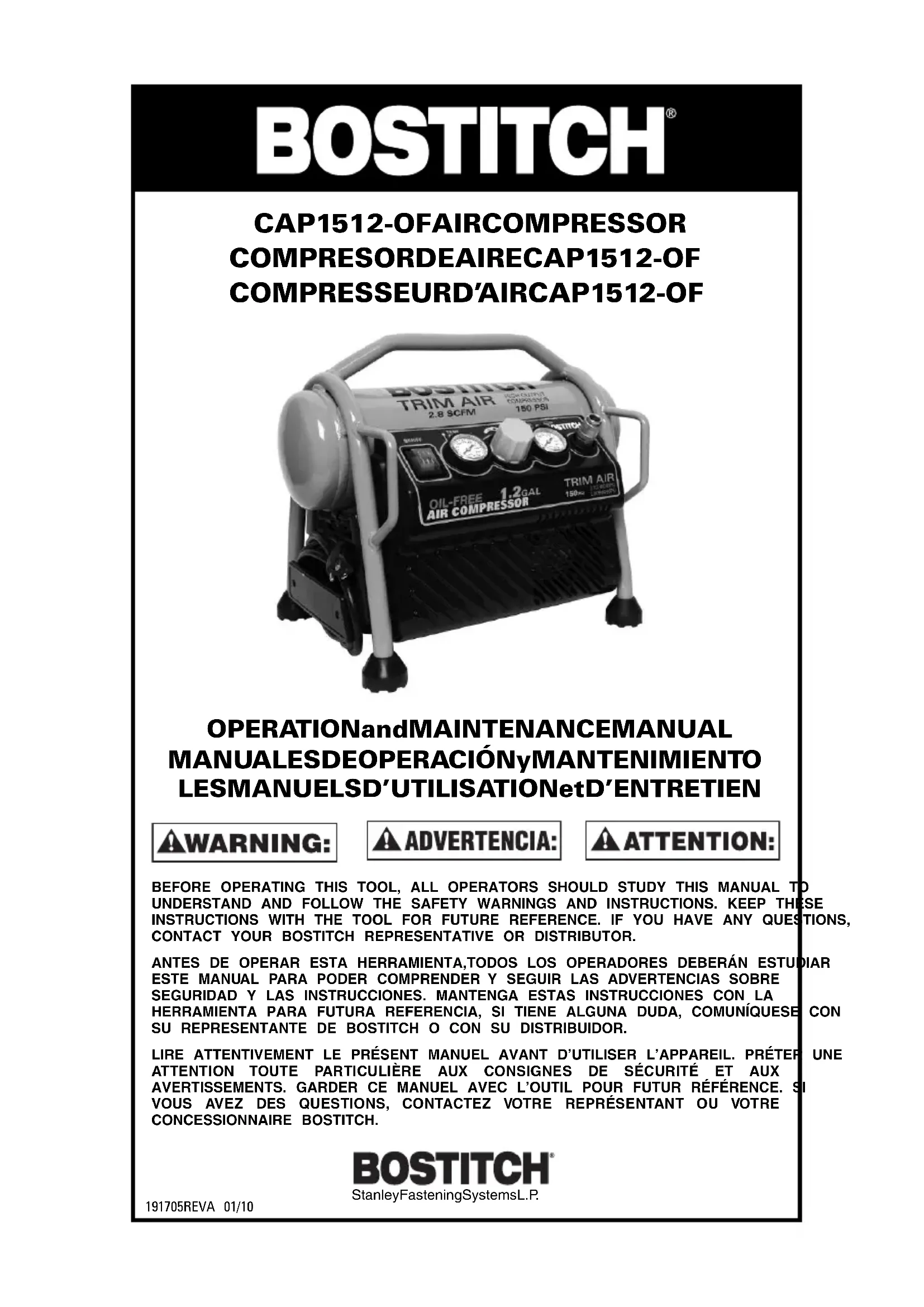 Stanley Fastening Systems L.P. (“Bostitch”) garantit à l’utilisateur final que ce produit est exempt de tout défaut de matériaux et de fabrication et accepte, le cas échéant, de réparer ou remplacer, à la discrétion de Bostitch, tout produit défectueux pendant une période de 1 an à partir de la date d’achat. Cette garantie n’est pas transférable. Elle couvre uniquement les dommages résultant de défaut de matériaux et de fabrication, et ne couvre pas les conditions ou défauts de fonctionnement résultant d’une usure normale, d’une négligence, d’un abus d’usage, d’un accident ou de tentatives de réparation par une entité autre que notre Centre de réparation local ou un Centre de service de garantie autorisé. CETTE GARANTIE REMPLACE TOUTE AUTRE GARANTIE EXPRESSE. TOUTE GARANTIE DE VALEUR MARCHANDE, DE QUALITÉ SATISFAISANTE, OU D’ADÉQUATION À UN USAGE PARTICULIER SE LIMITE À LA DURÉE DE CETTE GARANTIE EXPRESSE. BOSTITCH NE SERA PAS TENUE RESPONSABLE DES DOMMAGES INDIRECTS OU ACCESSOIRES. Cette garantie se limite aux ventes effectuées aux États-Unis et au Canada. Les limitations imposées par la durée d’une garantie implicite, ou l’exclusion des dommages occasionnels ou indirects n’étant pas reconnue dans certains États, les limitations ou exclusions précitées peuvent ne pas vous être adressées. La présente garantie vous donne des droits légaux spécifiques en complément des droits particuliers dont vous pouvez bénéficier et qui varient d’un État à l’autre. Pour obtenir des services liés à la garantie, retournez le produit à vos frais accompagné de la preuve d’achat à votre Centre de réparation local ou à un Centre de service de garantie autorisé. Pour obtenir l’adresse d’un Centre de service de garantie autorisé dans votre localité, composez le 1-800-556-6696.GUIDE DE DÉPANNAGE REMARQUE : COUPER LA SOURCE D’ALIMENTATION ET VIDANGER LE RÉSERVOIR AVANT D’EFFECTUER TOUT RÉGLAGE OU RÉPARATION. Problème Cause probable Solution L’appareil refuse de fonctionner La pression du réservoir dépasse le niveau d’enclenchement Une fois la pression descendue sous ce niveau, l’appareil se mettra en marche. La rallonge cause un appel de courant excessif Vérifier les recommandations pour un calibre approprié de la rallonge (l’utilisation de rallonges n’est pas recommandée). Fusible grillé ou disjoncteur déclenché Remplacer le fusible ou réarmer le disjoncteur L’appareil n’est pas sous tension ou en marche Vérifier l’interrupteur à pression et s’assurer qu’il est à la position On. S’assurer que l’appareil est branché. Température froide Placer le compresseur dans un environnement plus chaud durant au moins 30 minutes, (généralement sous le point de congélation) puis redémarrer. Fuites d’air aux raccords Raccords desserrés Serrer les raccords. Vérifier avec de l’eau savonneuse. NE PAS TROP SERRER. Fuite d’air à l’interrupteur sous pression Clapet anti-retour obstrué Retirer le clapet et le nettoyer L’appareil n’accumule aucune pression L’application exige une demande en air excessive Réduire la demande sur le compresseur Tête desserrée Serrer les boulons de la tête Joint statique soufflé. Retirer la tête et s'assurer que le joint d'étanchéité n'est pas brisé ou déformé. Remplacer au besoin. Ouvrir le robinet de vidange Fermer le robinet de vidange L’appareil n’accumule aucune pression Vannes usées ou défectueuses Retirer la tête puis remplacer les vannes. Fuite d’air au réservoir Soudures du réservoir d’air endommagées. NE PAS PERCER, SOUDER NI MODIFIER LE RÉSERVOIR DE QUELQUE FAÇON QUE CE SOIT. DES RÉSERVOIRS ENDOMMAGÉS OU MODIFIÉS PEUVENT SE ROMPRE. REMPLACER IMMÉDIATEMENT LE RÉSERVOIR.