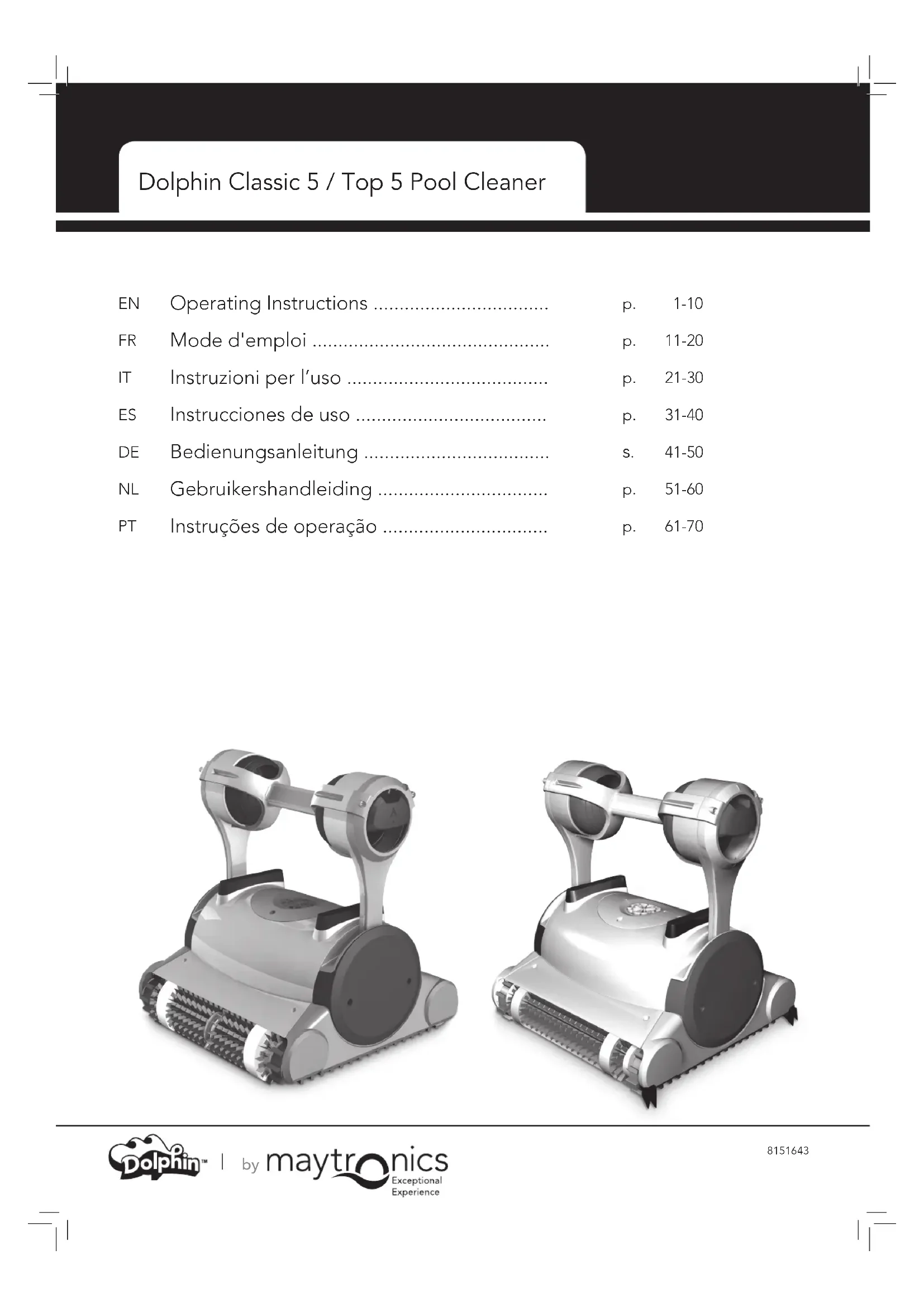 Dolphin Classic 5 / Top 5 nettoyeur de piscine Mode d'emploi FR12 Dolphin Classic 5 / Top 5 nettoyeur de piscine | Mode d'emploi Dolphin Classic 5 / Top 5 nettoyeur de piscine Mode d'emploi