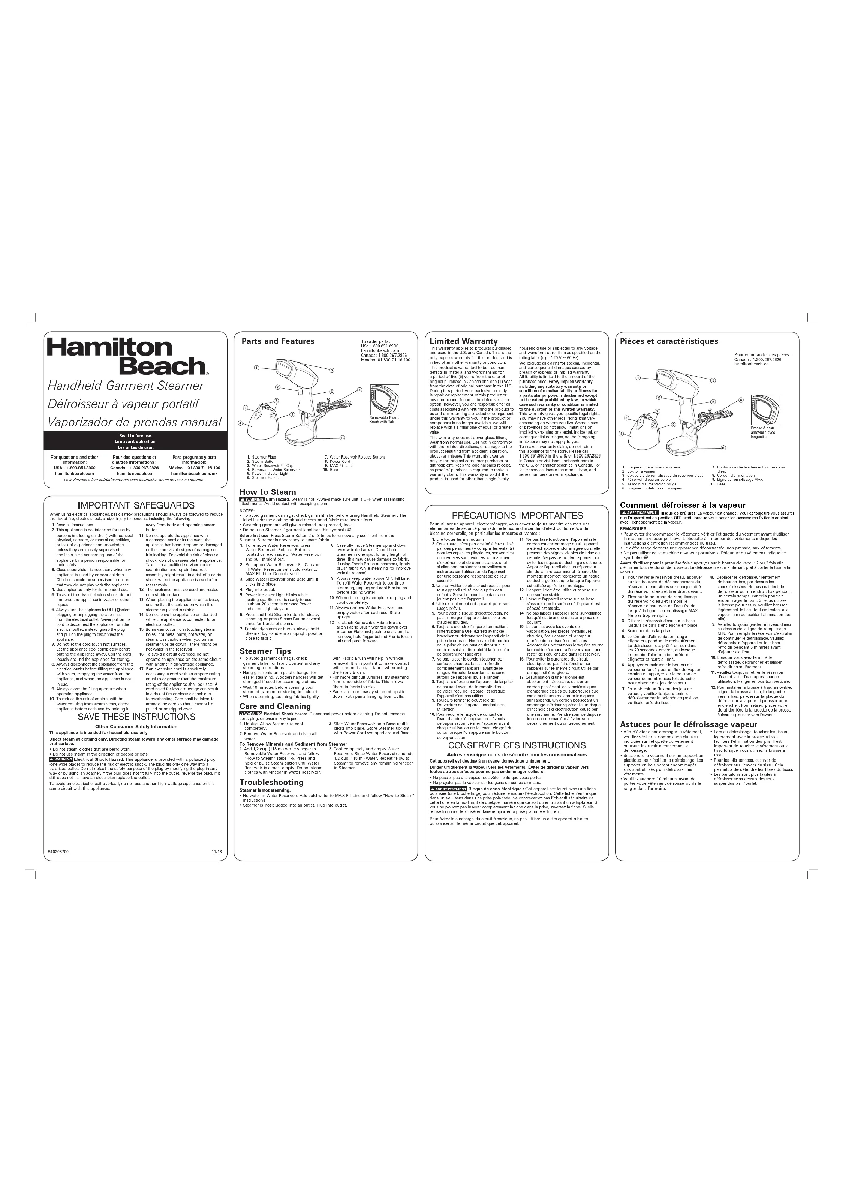- La machine à vapeur portative n’est pas branchée dans une prise de courant. Brancher dans une prise de courant. Garantie limitée Cette garantie s’applique aux produits achetés et utilisées aux É.-U. et au Canada. C’est la seule garantie expresse pour ce produit et est en lieu et place de tout autre garantie ou condition. Ce produit est garanti contre tout défaut de matériaux et de main-d’oeuvre pour une période de cinq (5) ans à compter de la date d’achat d’origine au Canada et un (1) an à compter de la date d’achat d’origine aux É.-U. Au cours de cette période, votre seul recours est la réparation ou le remplacement de ce produit ou tout composant s’avérant défectueux, à notre gré, mais vous êtes responsable de tous les coûts liés à l’expédition du produit et le retour d’un produit ou d’un composant dans le cadre de cette garantie. Si le produit ou un composant n’est plus offert, nous le remplacerons par un produit similaire de valeur égale ou supérieure. Cette garantie ne couvre pas le verre, les filtres, l’usure d’un usage normal, l’utilisation non conforme aux directives imprimées, ou des dommages au produit résultant d’un accident, modification, utilisation abusive ou incorrecte. Cette garantie s’applique seulement à l’acheteur original ou à la personne l’ayant reçu en cadeau. La présentation du reçu de vente d’origine comme preuve d’achat est nécessaire pour faire une réclamation au titre de cette garantie. Cette garantie s’annule si le produit est utilisé autrement que par une famille ou si l’appareil est soumis à toute tension ou forme d’onde différente des caractéristiques nominales précisées sur l’étiquette (par ex. : 120 V ~ 60 Hz). Nous excluons toutes les réclamations au titre de cette garantie pour les dommages spéciaux, consécutifs et indirects causés par la violation de garantie expresse ou implicite. Toute responsabilité est limitée au prix d’achat. Chaque garantie implicite, y compris toute garantie ou condition de qualité marchande ou d’adéquation à un usage particulier, est exonérée, sauf dans la mesure interdite par la loi, auquel cas la garantie ou condition est limitée à la durée de cette garantie écrite. Cette garantie vous donne des droits légaux précis. Vous pouvez avoir d’autres droits qui varient selon l’endroit où vous habitez. Certaines provinces ne permettent pas les limitations sur les garanties implicites ou les dommages spéciaux ou indirects de telle sorte que les limitations ci-dessus ne s’appliquent peut-être pas à votre cas. Ne pas retourner cet appareil au magasin lors d’une réclamation au titre de cette garantie. Téléphoner au 1.800.851.8900 aux É.-U. ou au 1.800.267.2826 au Canada ou visiter le site internet www.hamiltonbeach.com aux É.-U. ou www.hamiltonbeach.ca au Canada. Pour un service plus rapide, trouvez le numéro de modèle, le type d’appareil et les numéros de série sur votre appareil. SALVAGUARDIAS IMPORTANTES Cuando utilice aparatos eléctricos, siempre deben seguirse precauciones de seguridad básicas a fin de reducir el riesgo de incendio, descarga eléctrica, y/o lesiones a personas, incluyendo las siguientes: