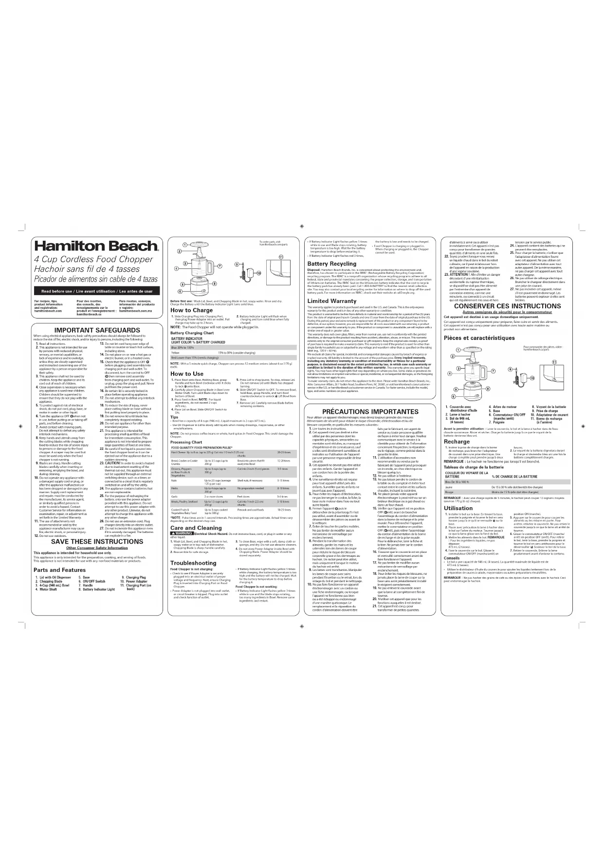 AVERTISSEMENT Risque de choc électrique. Ne pas immerger la base, le cordon ou la fiche dans l’eau ou tout autre liquide.1. Laver le couvercle, le récipient et la lame à hachere dans l’eau chaude savonneuse ou placer sur le panier supérieur du lave-vaisselle. La lame à hacher est tranchante; manipuler avec soins.2. Réassembler pour un rangement sécuritaire.3. Pour nettoyer la base, l’essuyer à l’aide d’une éponge ou d’un chiffon doux et humide et sécher. Ne pas utiliser de nettoyants abrasifs.4. Ne pas ranger l’adaptateur d’alimentation dans le bol avec la lame à hacher. L’adaptateur d’alimentation devrait être rangé séparément. Dépannage Le hachoir ne charge pas :• Vérifier que l’adaptateur de courant est branché de façon sécuritaire dans une prise électrique à la tension et à la fréquence appropriées. Ensuite, veiller à ce que la prise de charge soit insérée dans la borne de recharge du hachoir.• L’adaptateur d’alimentation n’est pas branché dans la prise murale ou le disjoncteur s’est déclenché. Brancher la fiche dans la prise et vérifier le fonctionnement de cette dernière.• Si le voyant de la batterie clignote 5 fois en jaune pendant le chargement, la température de la batterie est trop élevée et la batterie ne chargera pas. Attendre que la température de la batterie diminue avant de la charger.Le hachoir ne fonctionne pas :• Si le voyant de la batterie clignote 3 fois en jaune pendant l’utilisation et que la lame arrête de tourner, il y a trop d’ingrédients dans le bol. Retirer une certaine quantité d’ingrédients et recommencer.• Si le voyant de la batterie clignote 5 fois en jaune pendant l’utilisation et que la lame arrête de tourner, la température de la batterie est trop élevée. Attendre que la température de la batterie diminue avant de recommencer.• Si le voyant de la batterie clignote 3 fois en rouge, la batterie est faible et elle doit être rechargée.• Le hachoir est en cours de charge ou branché. Le hachoir ne peut pas être utilisé lorsqu’il est en cours de charge ou branché. Recyclage de la batterie Élimination : Comme Hamilton Beach Brands, Inc. se soucie de la protection de l’environnement, elle a choisi de participer au programme de recyclage Appel à Recycler . Appel à Recycler est un organisme à but non lucratif dont les programmes de recyclage respectent toutes les obligations fédérales, étatiques et provinciales concernant la collecte, l’entreposage et le transport appropriés des batteries au lithium-ion. Le sceau Appel à Recycler sur la batterie au lithium-ion indique que le coût de recyclage du bloc-batterie a déjà été payé. Appelez au 1 877 2-RECYCLE pour trouver le point de dépôt le plus près. Vous pouvez aussi communiquer avec le centre de tri local pour obtenir de l’information sur l’endroit où vous pouvez déposer les blocs-batteries utilisés. Pour plus d’information sur Appel à Recycler , veuillez visiter son site Web au appelarecycler.ca. Garantie limitée Cette garantie s’applique aux produits achetés et utilisées aux É.-U. et au Canada. C’est la seule garantie expresse pour ce produit et est en lieu et place de tout autre garantie ou condition. Ce produit est garanti contre tout défaut de matériaux et de main-d’oeuvre pour une période de cinq (5) ans à compter de la date d’achat d’origine au Canada et un (1) an à compter de la date d’achat d’origine aux É.-U. Au cours de cette période, votre recours exclusif se limitera au remplacement de ce produit ou tout autre composant défectueux, à notre discrétion. Cependant, vous êtes responsables des frais associés au retour du produit ou d’un composant en vertu de la présente garantie. Si le produit ou le composant est non disponible, nous le remplacerons avec un article similaire de valeur égale ou supérieure.Cette garantie ne couvre pas le verre, les filtres, l’usure d’un usage normal, l’utilisation non conforme aux directives imprimées, ou des dommages au produit résultant d’un accident, modification, utilisation abusive ou incorrecte. Cette garantie s’applique seulement à l’acheteur original ou à la personne l’ayant reçu en cadeau. La présentation du reçu de vente d’origine comme preuve d’achat est nécessaire pour faire une réclamation au titre de cette garantie. Cette garantie s’annule si le produit est utilisé autrement que par une famille ou si l’appareil est soumis à toute tension ou forme d’onde différente des caractéristiques nominales précisées sur l’étiquette (par ex. : 120 V ~ 60 Hz).Nous excluons toutes les réclamations au titre de cette garantie pour les dommages spéciaux, consécutifs et indirects causés par la violation de garantie expresse ou implicite. Toute responsabilité est limitée au prix d’achat. Chaque garantie implicite, y compris toute garantie ou condition de qualité marchande ou d’adéquation à un usage particulier, est exonérée, sauf dans la mesure interdite par la loi, auquel cas la garantie ou condition est limitée à la durée de cette garantie écrite. Cette garantie vous donne des droits légaux précis. Vous pouvez avoir d’autres droits qui varient selon l’endroit où vous habitez. Certaines provinces ne permettent pas les limitations sur les garanties implicites ou les dommages spéciaux ou indirects de telle sorte que les limitations ci-dessus ne s’appliquent peut-être pas à votre cas.Pour faire une réclamation au titre de la garantie, veuillez ne pas retourner cet appareil au magasin. Veuillez nous écrire à Hamilton Beach Brands, Inc., Attn: Consumer Affairs, 261 Yadkin Road, Southern Pines, NC 28387, ou visiter le site hamiltonbeach.com/customer-service aux États-Unis ou hamiltonbeach.ca/customer-service au Canada. Pour obtenir un service plus rapide, veuillez inclure les numéros de modèle, de type et de série de votre appareil. SALVAGU