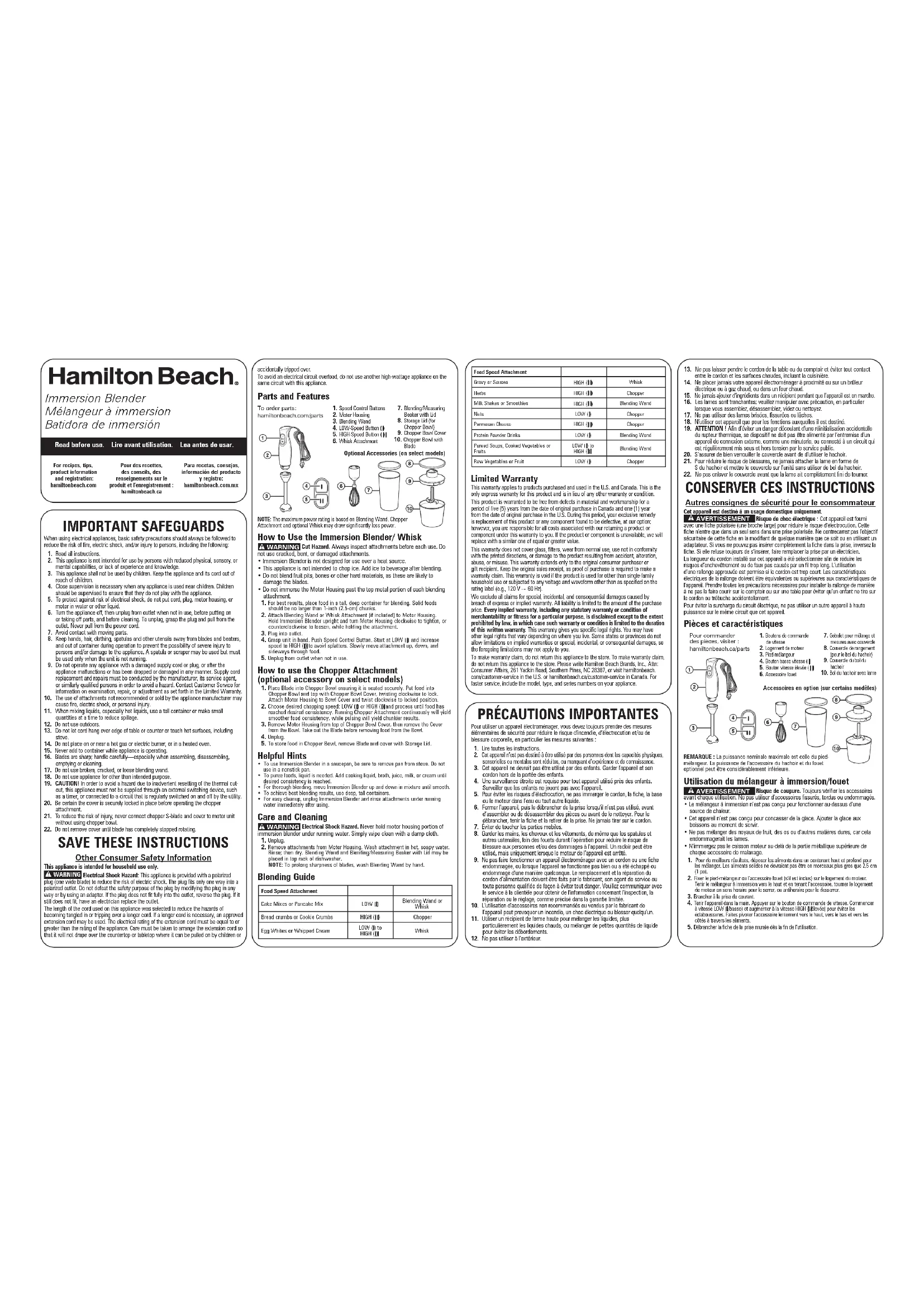 savonneuse. Rincer et sécher. Le pied-mélangeur et le gobelet pour mélange et mesures avec couvercle peuvent aller au lave-vaisselle dans le panier supérieur. REMARQUE : Pour prolonger l’affûtage des lames, laver le pied-mélangeur à la main. Guide de mélange Aliment Vitesse AccessoirePâtes à gâteaux ou à crêpesLOW ( /basse)Pied-mélangeur ou fouetChapelure ou miettes de biscuitHIGH ( /élevée)Hachoir à lameBlancs d’œufs ou crème fouettée LOW ( /basse) à HIGH ( /élevée)FouetSaucesHIGH ( /élevée)FouetFines herbesHIGH ( /élevée)Hachoir à lameLaits frappés ou frappés aux fruitsHIGH ( /élevée)Pied-mélangeur Noix LOW ( /basse)Hachoir à lameFromage parmesanHIGH ( /élevée)Hachoir à lameBoissons à la poudre protéinéeLOW ( /basse)Pied-mélangeurSoupes, légumes ou fruits cuitsLOW ( /basse) à HIGH ( /élevée)Pied-mélangeurLégumes ou fruits crusLOW ( /basse)Hachoir à lame Garantie limitée Cette garantie s’applique aux produits achetés et utilisées aux É.-U. et au Canada. C’est la seule garantie expresse pour ce produit et est en lieu et place de tout autre garantie ou condition. Ce produit est garanti contre tout défaut de matériaux et de main-d’oeuvre pour une période de cinq (5) ans à compter de la date d’achat d’origine au Canada et trois (3) ans à compter de la date d’achat d’origine aux É.-U. Au cours de cette période, votre seul recours est la réparation ou le remplacement de ce produit ou tout composant s’avérant défectueux, à notre gré, mais vous êtes responsable de tous les coûts liés à l’expédition du produit et le retour d’un produit ou d’un composant dans le cadre de cette garantie. Si le produit ou un composant n’est plus offert, nous le remplacerons par un produit similaire de valeur égale ou supérieure. Cette garantie ne couvre pas le verre, les filtres, l’usure d’un usage normal, l’utilisation non conforme aux directives imprimées, ou des dommages au produit résultant d’un accident, modification, utilisation abusive ou incorrecte. Cette garantie s’applique seulement à l’acheteur original ou à la personne l’ayant reçu en cadeau. La présentation du reçu de vente d’origine comme preuve d’achat est nécessaire pour faire une réclamation au titre de cette garantie. Cette garantie s’annule si le produit est utilisé autrement que par une famille ou si l’appareil est soumis à toute tension ou forme d’onde différente des caractéristiques nominales précisées sur l’étiquette (par ex. : 120 V ~ 60 Hz). Nous excluons toutes les réclamations au titre de cette garantie pour les dommages spéciaux, consécutifs et indirects causés par la violation de garantie expresse ou implicite. Toute responsabilité est limitée au prix d’achat. Chaque garantie implicite, y compris toute garantie ou condition de qualité marchande ou d’adéquation à un usage particulier, est exonérée, sauf dans la mesure interdite par la loi, auquel cas la garantie ou condition est limitée à la durée de cette garantie écrite. Cette garantie vous donne des droits légaux précis. Vous pouvez avoir d’autres droits qui varient selon l’endroit où vous habitez. Certaines provinces ne permettent pas les limitations sur les garanties implicites ou les dommages spéciaux ou indirects de telle sorte que les limitations ci-dessus ne s’appliquent peut-être pas à votre cas. Pour faire une réclamation au titre de la garantie, veuillez ne pas retourner cet appareil au magasin. Veuillez nous écrire à Hamilton Beach Brands, Inc., Attn: Consumer Affairs, 261 Yadkin Road, Southern Pines, NC 28387, ou visiter le site hamiltonbeach.com/customer-service aux États-Unis ou hamiltonbeach.ca/customer-service au Canada. Pour obtenir un service plus rapide, veuillez inclure les numéros de modèle, de type et de série de votre appareil. SALVAGUARDIAS IMPORTANTES Cuando utilice aparatos eléctricos, siempre deben seguirse precauciones de seguridad básicas a fin de reducir el riesgo de incendio, descarga eléctrica, y/o lesiones a personas, incluyendo las siguientes: