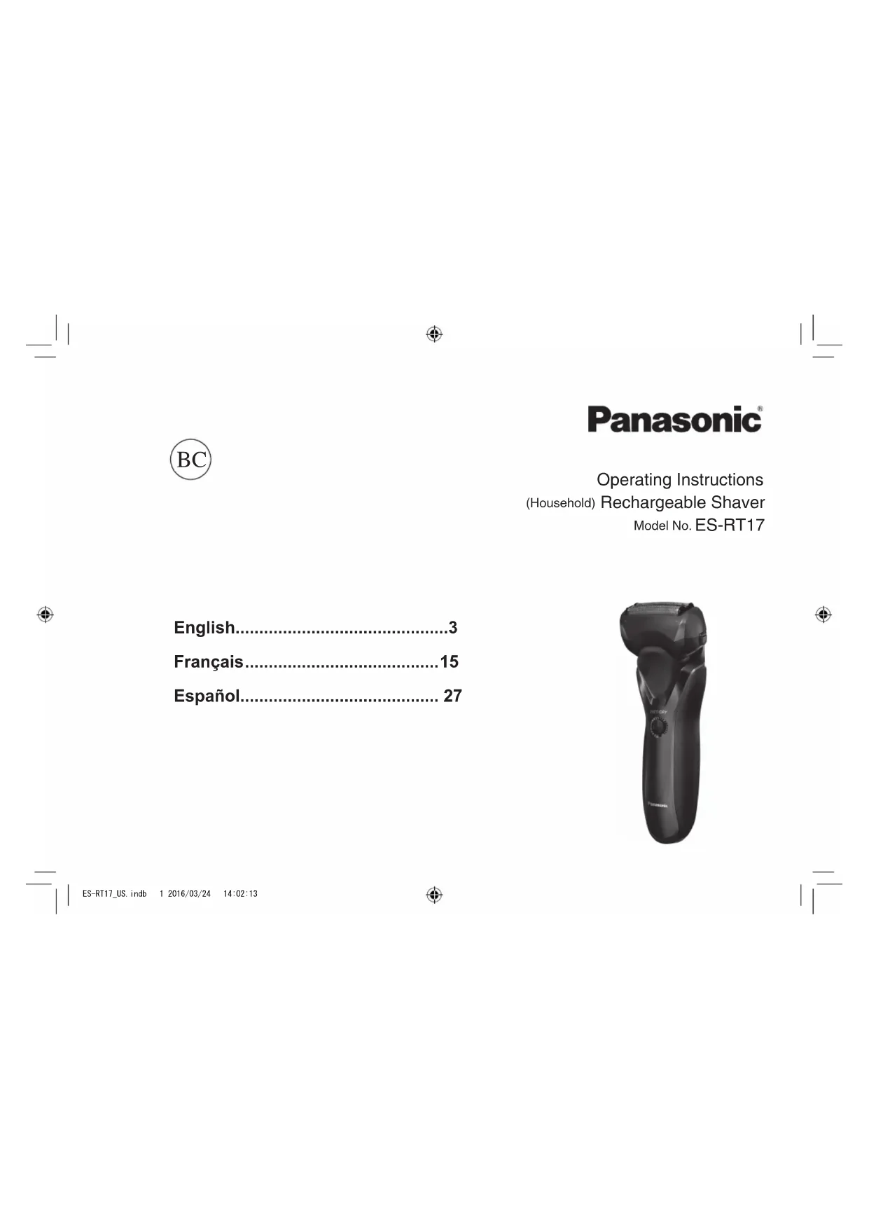 PURCHASE HOT LINE AT 1-800-332-5368. ES-RT17_US.indb 14 2016/03/24 14:02:1615 Français Mode d’emploi (Domestique) Rasoir rechargeable Modèle ES-RT17 Merci d’avoir choisi ce produit Panasonic. Avant de faire fonctionner cet appareil, veuillez lire toutes les instructions et les conserver pour une utilisation ultérieure. Consignes de sécurité ................... 16 Usage prévu 20 Identication des pièces 21 Chargement du rasoir 21 Utilisation du rasoir 22 Nettoyage du rasoir 23 Dépannage 24 Durée de vie de la pile 25 Retrait de la pile rechargeable intégrée