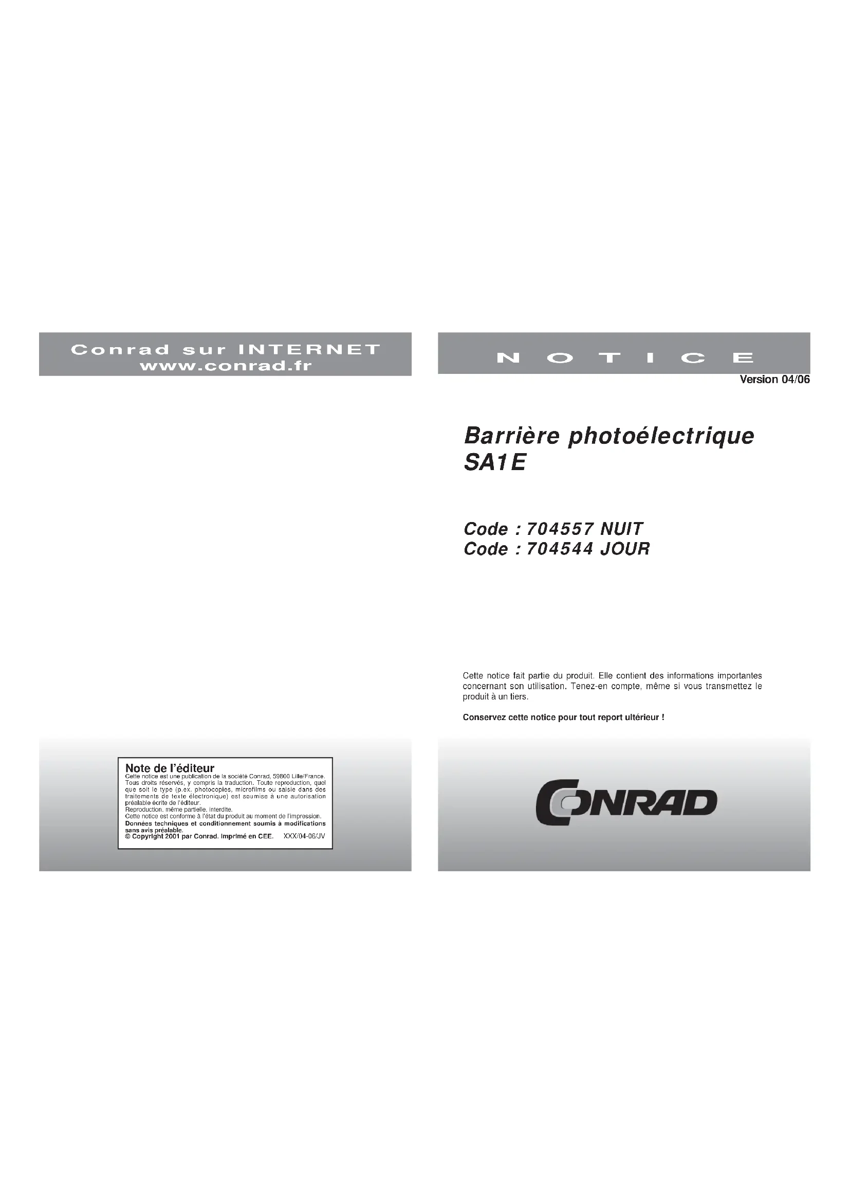 Note de l’éditeur Cette notice est une publication de la société Conrad, 59800 Lille/France.Tous droits réservés, y compris la traduction. Toute reproduction, quelque soit le type (p.ex. photocopies, microfilms ou saisie dans destraitements de texte électronique) est soumise à une autorisationpréalable écrite de l’éditeur.Reproduction, même partielle, interdite.Cette notice est conforme à l’état du produit au moment de l’impression.Données techniques et conditionnement soumis à modificationssans avis préalable. © Copyright 2001 par Conrad. Imprimé en CEE. XXX/04-06/JV Barrière photoélectrique SA1E Code : 704557 NUIT Code : 704544 JOUR Cette notice fait partie du produit. Elle contient des informations importantes concernant son utilisation. Tenez-en compte, même si vous transmettez le produit à un tiers. Conservez cette notice pour tout report ultérieur ! NOTICE Conrad sur INTERNET www.conrad.fr Version 04/06Pour travailler correctement et en toute sécurité, lisez la notice d’assemblage avant toute utilisation. Consignes de sécurité Lisez cette notice avant l’installation, la mise en service, le câblage et l’entretien. Lors de la transmission du produit, la personne qui a effectué le montage est considéré comme le fabricant et doit fournir tous les papiers d’accompagnement, ainsi que son nom et ses coordonnées Consignes d’installation