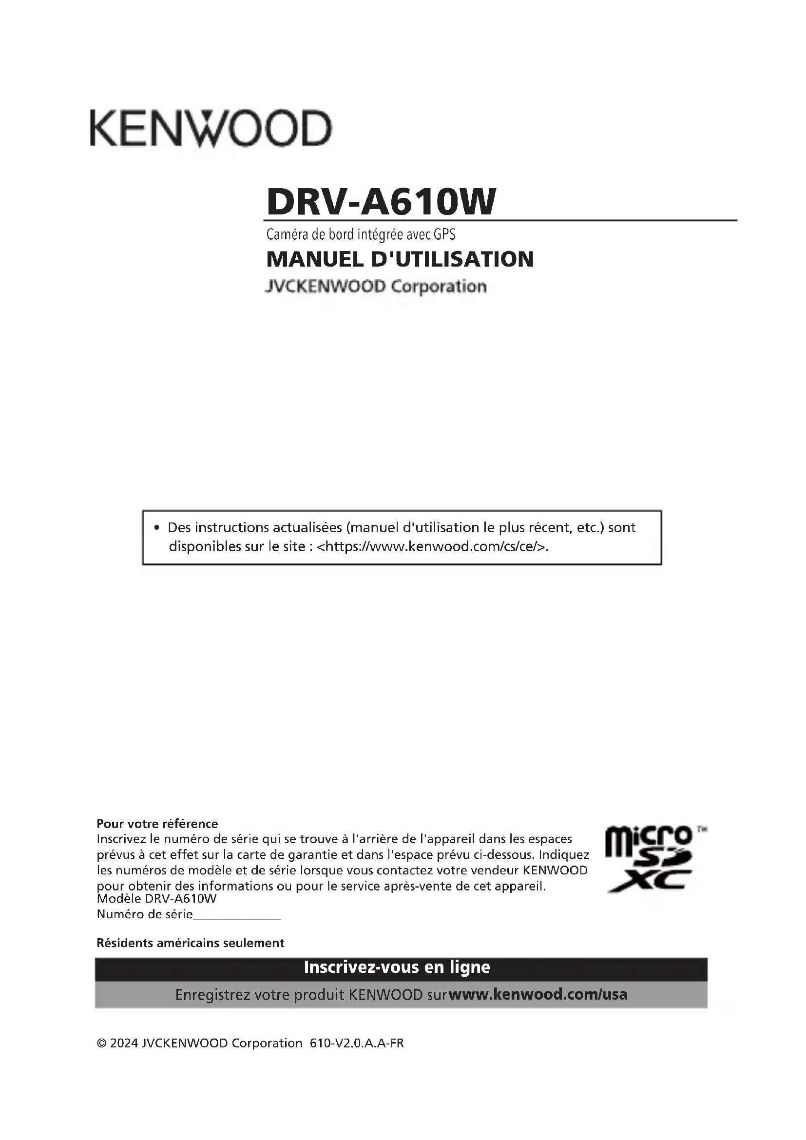 DRV-A610W © 2024 JVCKENWOOD Corporation 610-V2.0.A.A-FR Inscrivez-vous en ligne Enregistrez votre produit KENWOOD sur www.kenwood.com/usa Résidents américains seulement MANUEL D'UTILISATION