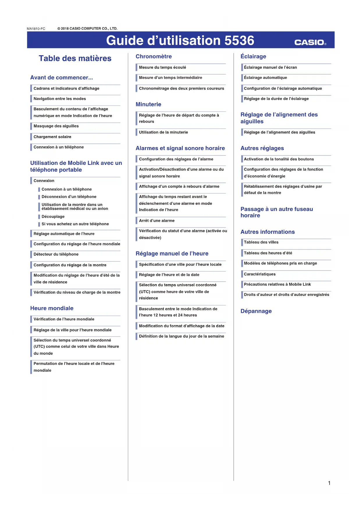 Table des matières Avant de commencer... Cadrans et indicateurs d’affichage Navigation entre les modes Basculement du contenu de l’affichage numérique en mode Indication de l’heure Masquage des aiguilles Chargement solaire Connexion à un téléphone Utilisation de Mobile Link avec un téléphone portable Connexion Connexion à un téléphone Déconnexion d’un téléphone Utilisation de la montre dans un établissement médical ou un avion Découplage Si vous achetez un autre téléphone Réglage automatique de l’heure Configuration du réglage de l’heure mondiale Détecteur du téléphone Configuration du réglage de la montre Modification du réglage de l’heure d’été de la ville de résidence Vérification du niveau de charge de la montre Heure mondiale Vérification de l’heure mondiale Réglage de la ville pour l’heure mondiale Sélection du temps universel coordonné (UTC) comme celui de votre ville dans Heure du monde Permutation de l’heure locale et de l’heure mondiale MA1810-FC © 2018 CASIO COMPUTER CO., LTD. Chronomètre Mesure du temps écoulé Mesure d’un temps intermédiaire Chronométrage des deux premiers coureurs Minuterie Réglage de l’heure de départ du compte à rebours Utilisation de la minuterie Alarmes et signal sonore horaire Configuration des réglages de l’alarme Activation/Désactivation d’une alarme ou du signal sonore horaire Affichage d’un compte à rebours d’alarme Affichage du temps restant avant le déclenchement d’une alarme en mode Indication de l’heure Arrêt d’une alarme Vérification du statut d’une alarme (activée ou désactivée) Réglage manuel de l’heure Spécification d’une ville pour l’heure locale Réglage de l’heure et de la date Sélection du temps universel coordonné (UTC) comme heure de votre ville de résidence Basculement entre le mode Indication de l’heure 12 heures et 24 heures Modification du format d’affichage de la date Définition de la langue du jour de la semaine Éclairage Éclairage manuel de l’écran Éclairage automatique Configuration de l’éclairage automatique Réglage de la durée de l’éclairage Réglage de l’alignement des aiguilles Réglage de l’alignement des aiguilles Autres réglages Activation de la tonalité des boutons Configuration des réglages de la fonction d’économie d’énergie Rétablissement des réglages d’usine par défaut de la montre Passage à un autre fuseau horaire Autres informations Tableau des villes Tableau des heures d’été Modèles de téléphones pris en charge Caractéristiques Précautions relatives à Mobile Link Droits d’auteur et droits d’auteur enregistrés Dépannage Guide d’utilisation 5536 1Avant de commencer... Cette section vous propose un aperçu de votre montre et vous explique comment la connecter à un téléphone. Si une connexion est établie avec le téléphone, l’heure de la montre se règle automatiquement. Vous pouvez également modifier les autres réglages de la montre. Remarque