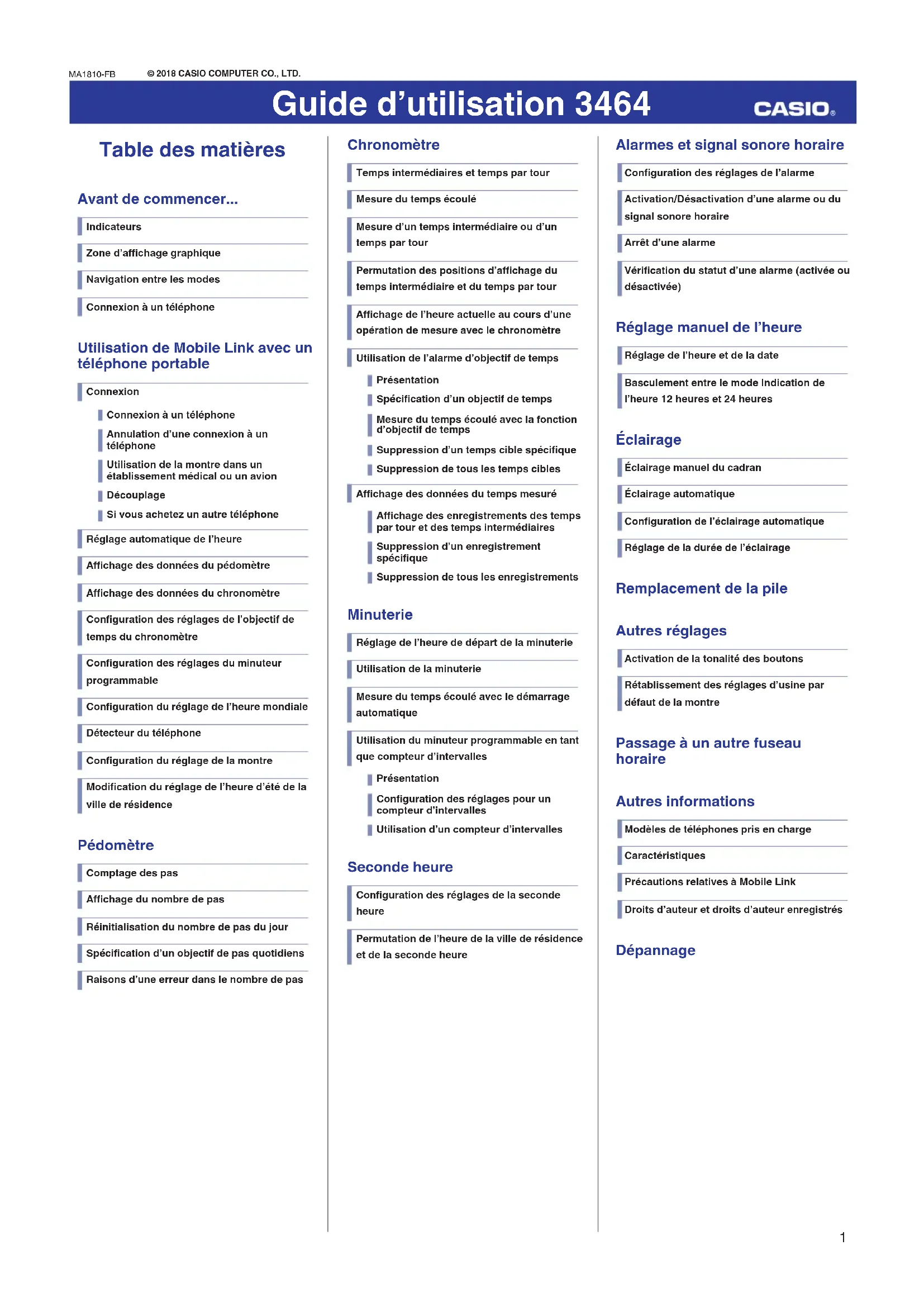 Table des matières Avant de commencer... Indicateurs Zone d’affichage graphique Navigation entre les modes Connexion à un téléphone Utilisation de Mobile Link avec un téléphone portable Connexion Connexion à un téléphone Annulation d’une connexion à un téléphone Utilisation de la montre dans un établissement médical ou un avion Découplage Si vous achetez un autre téléphone Réglage automatique de l’heure Affichage des données du pédomètre Affichage des données du chronomètre Configuration des réglages de l’objectif de temps du chronomètre Configuration des réglages du minuteur programmable Configuration du réglage de l’heure mondiale Détecteur du téléphone Configuration du réglage de la montre Modification du réglage de l’heure d’été de la ville de résidence Pédomètre Comptage des pas Affichage du nombre de pas Réinitialisation du nombre de pas du jour Spécification d’un objectif de pas quotidiens Raisons d’une erreur dans le nombre de pas MA1810-FB © 2018 CASIO COMPUTER CO., LTD. Chronomètre Temps intermédiaires et temps par tour Mesure du temps écoulé Mesure d’un temps intermédiaire ou d’un temps par tour Permutation des positions d’affichage du temps intermédiaire et du temps par tour Affichage de l’heure actuelle au cours d’une opération de mesure avec le chronomètre Utilisation de l’alarme d’objectif de temps Présentation Spécification d’un objectif de temps Mesure du temps écoulé avec la fonction d’objectif de temps Suppression d’un temps cible spécifique Suppression de tous les temps cibles Affichage des données du temps mesuré Affichage des enregistrements des temps par tour et des temps intermédiaires Suppression d’un enregistrement spécifique Suppression de tous les enregistrements Minuterie Réglage de l’heure de départ de la minuterie Utilisation de la minuterie Mesure du temps écoulé avec le démarrage automatique Utilisation du minuteur programmable en tant que compteur d’intervalles Présentation Configuration des réglages pour un compteur d’intervalles Utilisation d’un compteur d’intervalles Seconde heure Configuration des réglages de la seconde heure Permutation de l’heure de la ville de résidence et de la seconde heure Alarmes et signal sonore horaire Configuration des réglages de l’alarme Activation/Désactivation d’une alarme ou du signal sonore horaire Arrêt d’une alarme Vérification du statut d’une alarme (activée ou désactivée) Réglage manuel de l’heure Réglage de l’heure et de la date Basculement entre le mode Indication de l’heure 12 heures et 24 heures Éclairage Éclairage manuel du cadran Éclairage automatique Configuration de l’éclairage automatique Réglage de la durée de l’éclairage Remplacement de la pile Autres réglages Activation de la tonalité des boutons Rétablissement des réglages d’usine par défaut de la montre Passage à un autre fuseau horaire Autres informations Modèles de téléphones pris en charge Caractéristiques Précautions relatives à Mobile Link Droits d’auteur et droits d’auteur enregistrés Dépannage Guide d’utilisation 3464 1Avant de commencer... Cette section vous propose un aperçu devotre montre et vous explique comment laconnecter à un téléphone. La connexion à untéléphone permet de synchroniser l’heure dela montre avec celle du téléphone, ainsi qued’afficher le compte de pas consigné par lamontre et les données du chronomètre surl’écran du téléphone. Remarque