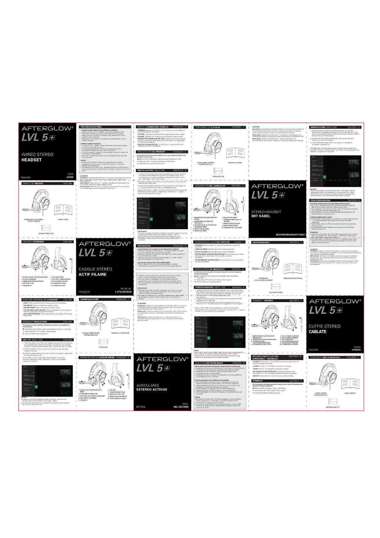 EINRICHTUNG: XBOX ONE1. Prüfen, ob unten am Xbox One Wireless Controller ein 3,5-mm-Anschluss für Audiogeräte vorhanden ist. Ist dies nicht der Fall, ist der Kauf eines separaten Headset-Adapters erforderlich (weitere Inform-ationen unter „Fehlerbehebung“)2. Den 3,5-mm-Aux-Stecker des Headsets unten an den Xbox One Wireless Controller anschließen.3. In den Audioeinstellungen prüfen, ob das LVL 5+-Headset als Audiogerät ausgewählt ist.Zum Öffnen der Controller-Einstellungen die Menü-Taste am Xbox One Controller drücken> „Einstellungen“ auswählen> Lautstärkepegel Ihres Headsets wie gewünscht anpassen.DEUTSCH - 5NOMENCLATUREFRANÇAIS - 1CASQUE STÉRÉO FILAIREAFTERGLOW LVL 5+GUIDE DE L'UTILISATEUR2 PILES AAAINSTALLATION: XBOX ONE1. Commencez par vérifier la base de votre manette sans fil Xbox One pour vous assurer qu'elle dispose d'un port de 3,5 mm pour l'audio. Si ce n'est pas le cas, vous devrez acquérir un adaptateur de casque en plus (voir « Dépannage » pour en savoir plus).2. Branchez la fiche Aux de 3,5 mm du communicateur sur la base de votre manette sans fil Xbox One.3. Vérifiez vos paramètres audio afin de vous assurer que votre casque LVL 5+ soit bien sélectionné en tant que périphérique audio.APERCU COMMANDE OREILLE FRANÇAIS - 3FRANÇAIS - 5• SOURDINE: Appuyez sur le bouton une seule fois pour activer/désactiver le mode sourdine du microphone.• VOLUME +: Appuyez sur ce bouton pour augmenter le volume maître.• VOLUME -: Appuyez sur ce bouton pour diminuer le volume maître.• INTERRUPTEUR MODE ACTIF ON / OFF: Ce bouton sert à faire passer le casque en mode actif, déclenchant ainsi l'amplificateur, les voyants DEL et la fonction QuadBoost.• MOLETTE POTENTIOMÈTRE: Ce bouton sert à augmenter/diminuer l'intensité de l'effet du QuadBoost.INDICATEURS DU PRODUITFRANÇAIS - 4Les fonctions des commandes situées au dos de la coque de gauche sont indiquées comme suit: Mode actif ON : Amplificateur, DEL et fonction Quad Boots sur ON Mode actif OFF : Le casque fonctionne en mode passif Ajustement du niveau de retour tactilPRÉSENTATION DU CASQUE-MICROFRANÇAIS - 21. MICRO AVEC SUPPRESSION DE BRUIT2. COUSSINETS OREILLE PU3. MOTEURS DE 40 MM EN NÉODYME4. BOUTON DE SOURDINE5. VOLUME +6. VOLUME -7. COMPARTIMENT PILES8. MODE ACTIF ON / OFF9. NIVEAU DE QUAD BOOST10. FICHE AUDIO À 4 PÔLES