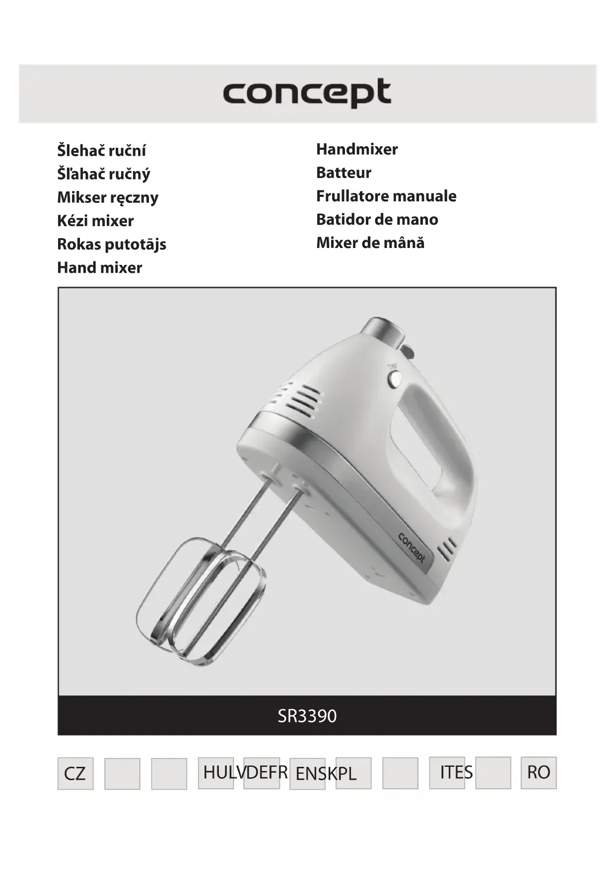 - Les sachets en plastique (PE) sont à remettre dans le centre de collecte sélective pour recyclage. Recyclage de l’appareil à la fin de sa durée de vie: La désignation du produit est conforme à la Directive européenne 2012/19/EU relative aux déchets d'équipements électriques et électroniques (WEEE). Le symbole apposé sur le produit ou son emballage indique que le produit ne doit pas être éliminé avec les déchets municipaux. Il est nécessaire de le remettre dans un centre de collecte pour le recyclage des équipements électriques et électroniques. En assurant une élimination conforme de ce produit, vous pouvez empêcher tout impact négatif sur l’environnement et sur la santé humaine résultant de la liquidation non conforme de ce produit. Éliminer le produit en conformité à la réglementation de traitement de déchets. De plus amples informations concernant le recyclage peuvent être obtenues auprès de l’administration locale compétente, les centres de tri de déchets ménagers ou dans le magasin où vous avez acheté votre produit. Ce produit satisfait aux exigences élémentaires des directives EU applicables. Le fabricant se réserve le droit d’effectuer les modifications du texte, design et spécifications techniques sans information préalable.46 47 ITIT RINGRAZIAMENTO Grazie per aver acquisito il prodotto di marchio Concept e vi auguriamo che vi dia la massima soddisfazione per tutta la durata della sua vita utile. Si consiglia di leggere attentamente l’intero manuale d’uso prima di procedere al primo uso dell’apparecchio stesso. Conservare bene il manuale d’uso. Provvedere che tutte le persone addette all’uso del prodotto facciano la conoscenza del manuale d’uso. Parametri tecnici Tensione 220–240 V ~ 50/60 Hz Potenza assorbita 500 W Livello di potenza acustica 80 dB(A) Il tempo di funzionamento ininterrotto (KB) montatura/impastatura (velocità 1–5) – max. 5 min.