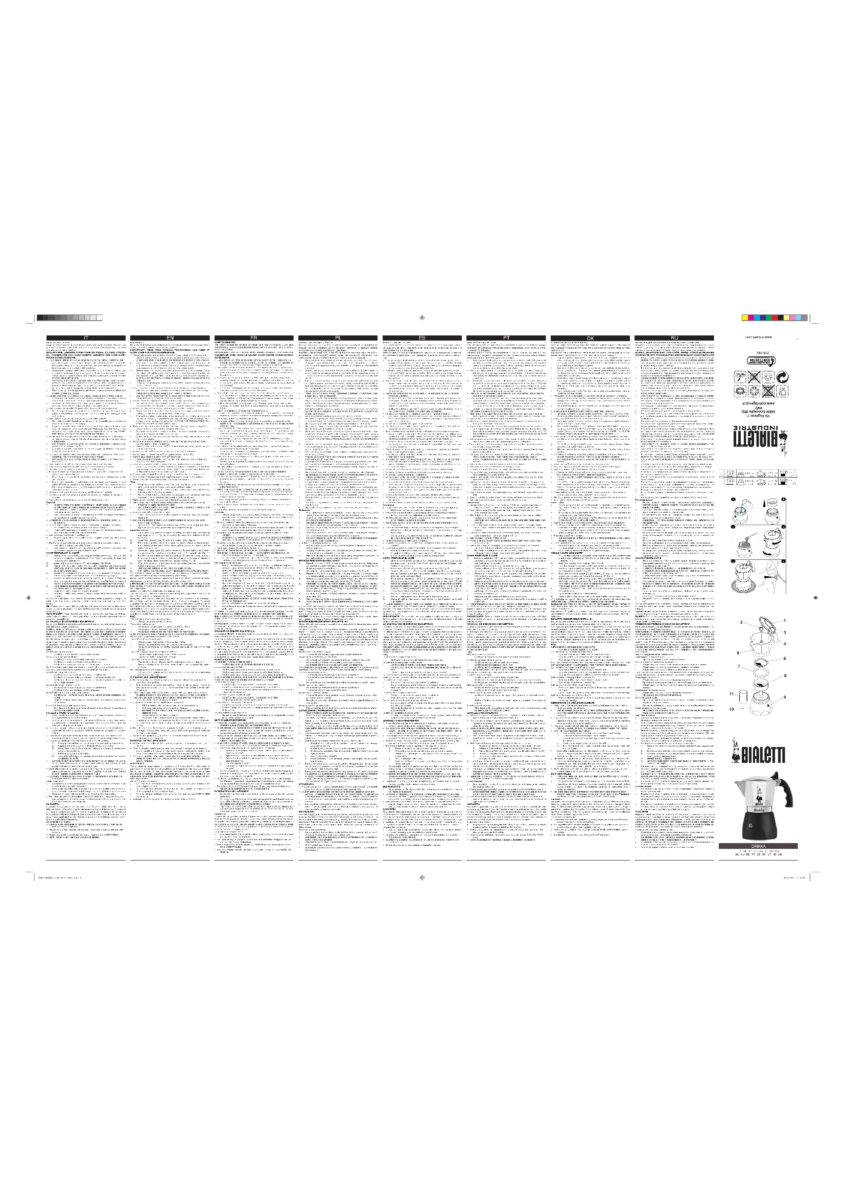 - L’adeguata raccolta diff erenziata e il corretto smaltimento contribui- scono ad evitare possibili eff etti negativi sull’ambiente e sulla salute e favorisce il riciclo dei materiali di cui è composto il prodotto. • Per informazioni più dettagliate inerenti i sistemi di raccolta disponi- bili, rivolgersi al servizio locale di smaltimento rifi uti, o al negozio in cui è stato eff ettuato l’acquisto.GARANZIAIl prodotto è garantito per un periodo di 24 mesi dalla data di acquisto, alle condizioni di funzionamento del presente foglio di istruzioni. In caso di richiesta di assistenza, per far valere la garanzia, è necessario contattare il venditore o Bialetti Industrie Spa e mostrare la prova di acquisto, o un documento equivalente, che riporti gli estremi di identifi cazione del riven- ditore e della data d’acquisto. La garanzia non copre: • I componenti sostituibili (piastrina, imbuto, guarnizione e manico) se non per difetti originari; • Guasti e/o difetti causati da un uso improprio o non conforme alle istruzioni; • Guasti e/o difetti causati dall’utilizzo di ricambi non COMPATIBILI • Danni dovuti a urti, cadute e depositi di calcare. AVERTISSEMENTSLire attentivement les conseils contenus dans ces instructions ì, car elles renferment d’importantes indications concernant la sécurité, l’emploi et l’en-tretien du produit. IMPORTANT LIRE ATTENTIVEMENT AVANT CHAQUE UTILISATION, CONSERVER AVEC SOIN LE LIVRET POUR TOUTE CONSULTATION ULTÉRIEURE. • Cette notice doit être considérée comme faisant partie intégrante du produit et pendant toute la durée de vie du produit. Ces documents doivent être remis à tous les futurs propriétaires du produit. • Attention : cette cafetière nécessite une source de chaleur pour son fonctionnement et développe à l’intérieur une pression. Le non-res-pect des instructions peut provoquer des brûlures ou l’explosion de la cafetière. • S’assurer que le produit soit en parfait état, que tous les composants soient présents et que les accessoires, valve, fi ltre entonnoir, joint et fi ltre soient bien placés. En cas de doute, s’adresser au revendeur ou au fabricant. • Enlever les emballages de la cafetière ainsi que toutes les notices d’avertissement qui se trouvent à l’intérieur.• Ce produit n’est pas conçu pour être utilisé par des personnes (y com-pris les enfants) dotées de capacités physiques, sensorielles et men-tales réduites ou n’ayant pas l’expérience et les connaissances néces-saires. Garder hors de la portée des enfants.• Utiliser la cafetière uniquement pour l’usage pour lequel elle a été conçue. Le produit doit être utilisé uniquement pour un usage domes-tique.• Surveiller l’appareil pendant son fonctionnement. • Éviter de toucher les surfaces chaudes : les surfaces deviennent chaudes, utiliser le manche et le pommeau pour manipuler la cafetière. • Ne jamais utiliser la cafetière sans eau. • Ne jamais utiliser d’autres liquides dans la chaudière ou dans la partie supérieure : la chaudière a été conçue pour fonctionner exclusivement avec de l’eau. • Cette cafetière doit être utilisée exclusivement avec de l’eau et du café moulu pour cafetières Moka à usage domestique : ne jamais utiliser d’autres produits (ex. orge, cacao, extraits de café, thé, CAFÉ POUR FILTRES OU POUR MACHINES À EXPRESSOS). • S’assurer que le jet de vapeur soit orienté loin de l’utilisateur, en pre-nant garde à ce que la soupape de sécurité ne soit pas tournée vers l’utilisateur.• Pour obtenir un excellent café crémeux, il est très important de respec-ter les bonnes doses d’eau et de café.