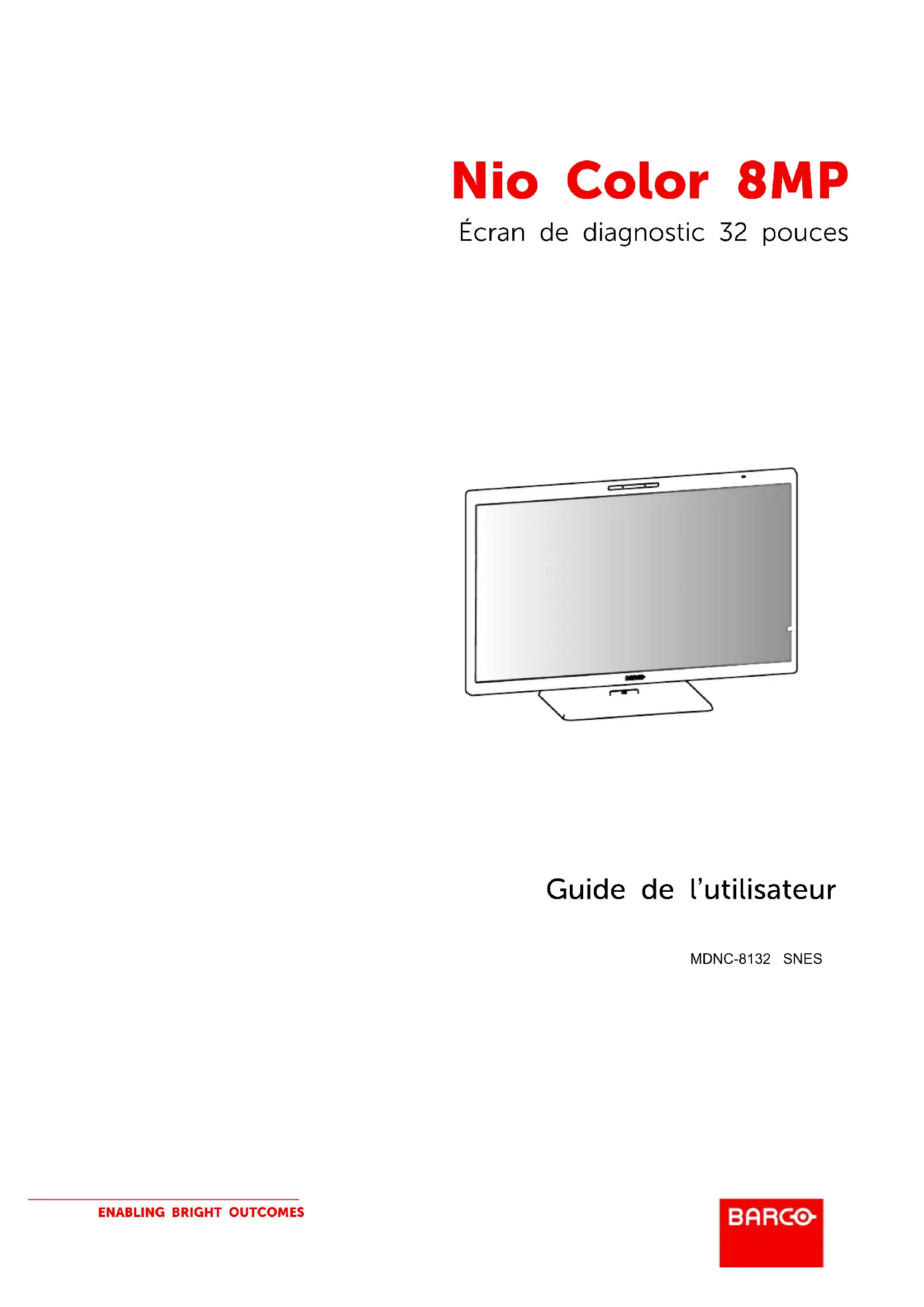MDNC-8132 SNES Guide de l’utilisateur Écran de diagnostic 32 pouces Nio Color 8MPBarco NV Beneluxpark 21, 8500 Kortrijk, Belgium Registered office: Barco NV President Kennedypark 35, 8500 Kortrijk, BelgiumNote de Copyright Ce document est protégé par copyright. Tous droits réservés. Ce document et aucune partie de celui-ci ne peuvent être reproduits ou copiés, sous quelque forme ou par quelque moyen que ce soit, graphique, électronique ou mécanique, y compris la photocopie, l’enregistrement sur bande ou dans des systèmes de stockage et de recherche de données, sans la permission écrite de Barco. © 2024 Barco NV Tous droits réservés. Avis de non-responsabilité Bien que tous les efforts aient été déployés pour préserver l’exactitude technique de ce document, nous n’assumons aucune responsabilité pour les erreurs éventuelles. Notre but est de vous fournir la documentation la plus précise et la mieux exploitable possible. Si vous découvrez des erreurs, n’hésitez pas à nous les signaler. Les produits logiciels Barco sont la propriété de Barco. Ils sont distribués sous copyright par Barco NV ou Barco Inc., pour être utilisés exclusivement dans le respect des termes spécifiques du contrat de licence du logiciel conclu entre Barco NV ou Barco Inc. et le détenteur de la licence. Aucune autre utilisation, duplication ou divulgation d’un produit logiciel Barco n’est autorisée, sous quelque forme que ce soit. Les caractéristiques des produits Barco sont susceptibles d’être modifiées sans avis préalable. Marques Toutes les marques et marques déposées appartiennent à leurs propriétaires respectifs. DisplayPort™ et le logo DisplayPort™ sont des marques déposées de la Video Electronics Standards Association (VESA