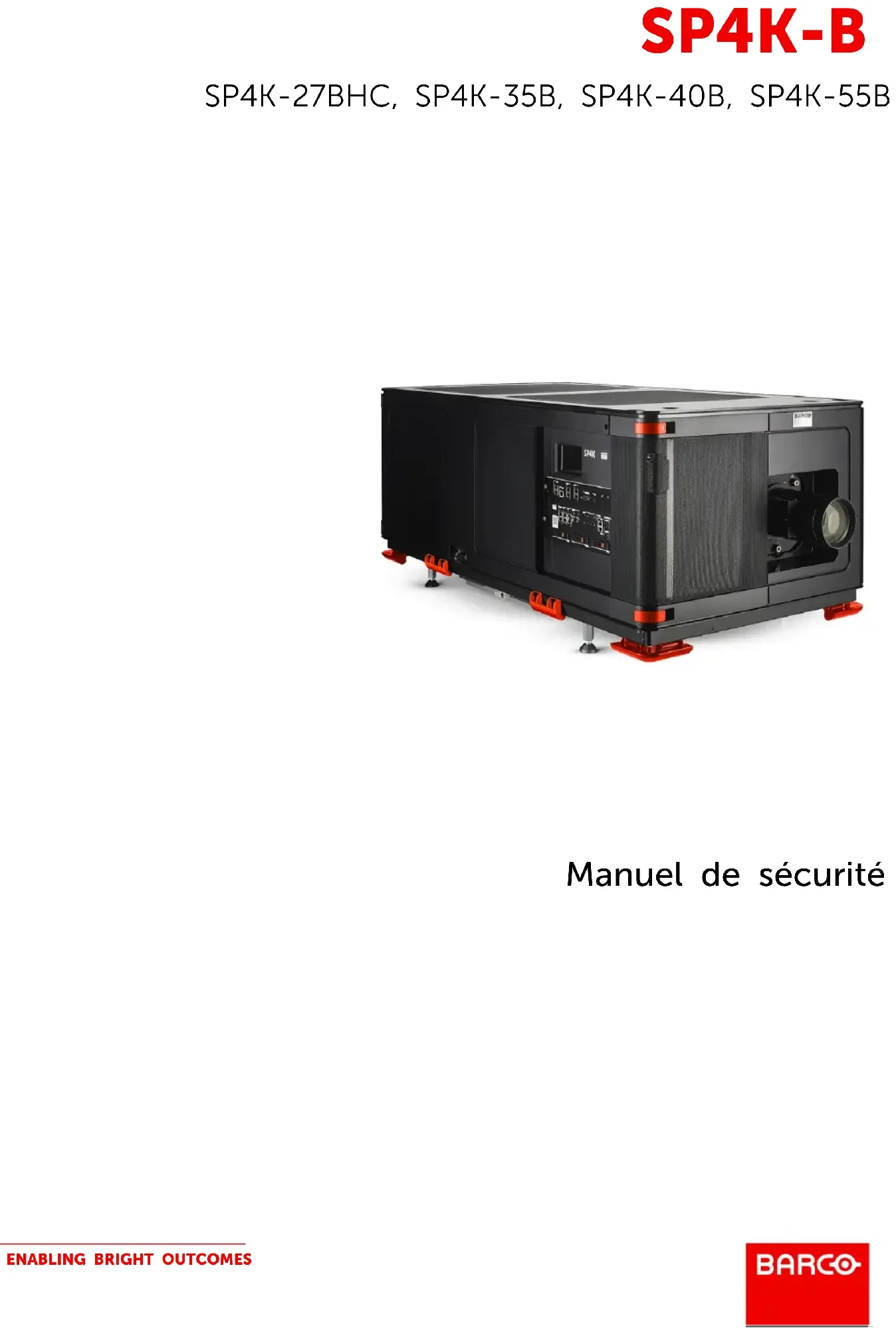 À propos de ce document Lisez attentivement ce document. Il contient des informations importantes pour éviter les dommages corporels pendant l'installation et l'utilisation du projecteur SP4K-B. Il comporte en outre plusieurs mises en garde afin d'éviter d'endommager le projecteur SP4K-B. Veillez à bien comprendre et suivre l'ensemble des consignes de sécurité et avertissements mentionnés dans ce chapitre avant d'installer le projecteur SP4K-B. Clarification du terme « SP4K-B » utilisé dans ce document Lorsque ce document fait référence au terme « SP4K-B », cela signifie que le contenu s’applique aux produits Barco suivants :
