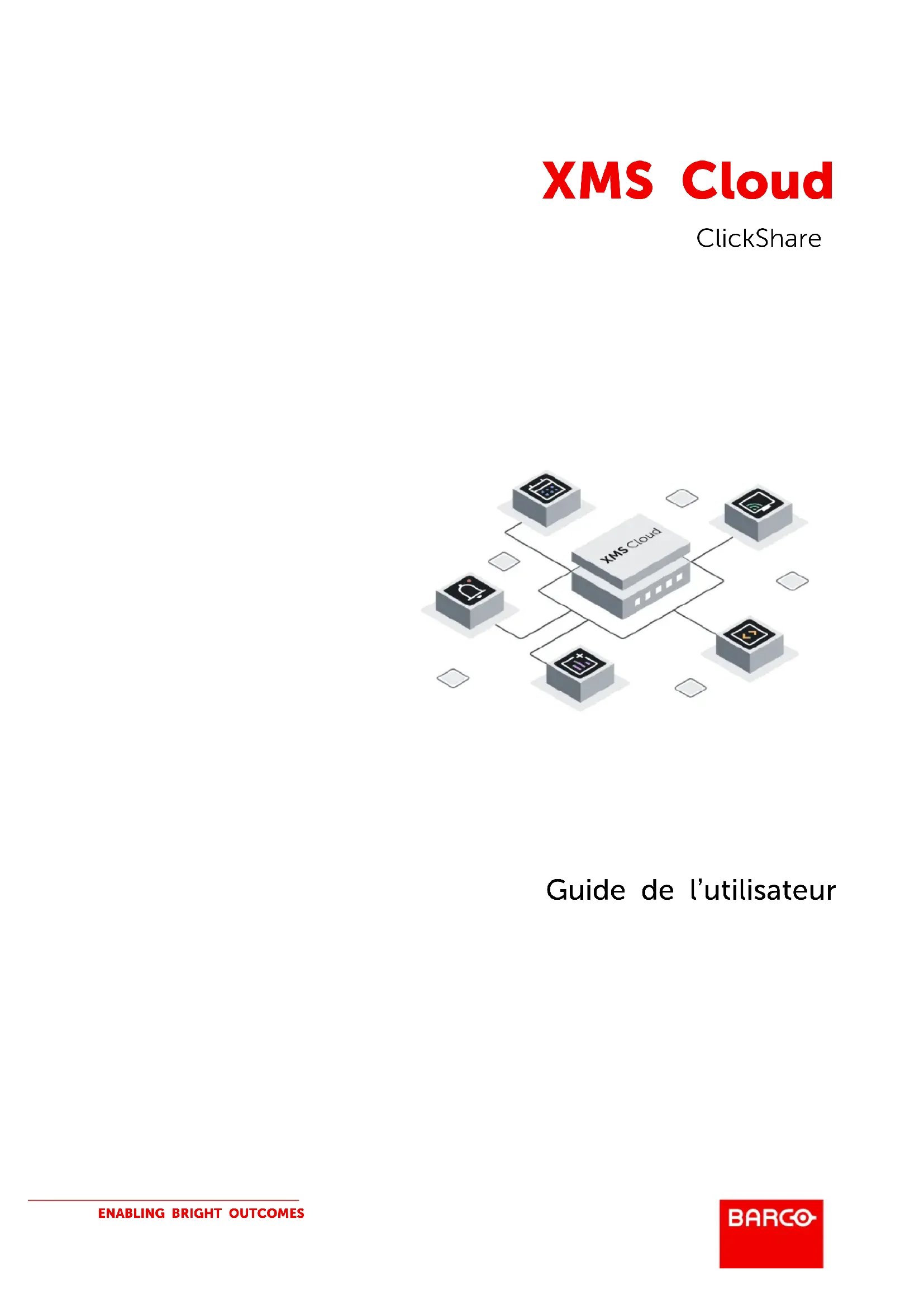 Guide de l’utilisateur ClickShare XMS CloudBarco NV Beneluxpark 21, 8500 Kortrijk, Belgium Registered office: Barco NV President Kennedypark 35, 8500 Kortrijk, Belgium Révision du produit Firmware : 2.19Modifications Barco fournit ce manuel « tel quel » sans aucune garantie, expresse ou implicite. Ceci concerne également, sans toutefois s'y limiter, les garanties implicites de qualité marchande et de conformité à des fins particulières. Barco pourra, à tout moment et sans notification préalable, apporter des améliorations et/ou des modifications au(x) produit(s) et/ou à la/aux gamme(s) décrits dans la présente publication. Il n'est pas exclu que des imprécisions techniques ou des erreurs typographiques se soient glissées dans cette publication. Les informations contenues dans cette publication sont modifiées périodiquement ; ces modifications sont intégrées aux nouvelles éditions de cette publication. La dernière édition des manuels Barco peut être téléchargée sur le site Web de Barco www.barco.com. Copyright © Tous droits réservés. Toute copie, reproduction ou traduction de ce document, en tout ou partie, est interdite. Le présent document ne peut être enregistré, transmis ou stocké dans un système de récupération sans l’autorisation écrite préalable de Barco. Protection par brevet (Voir la section www.barco.com/about-barco/legal/patents) Marques Les noms commerciaux ainsi que les noms de produit figurant dans la présente notice d'utilisation peuvent être des marques, déposées ou non, ou droits d'auteur de leur détenteur respectif. Tous les noms de marque et les noms de produit présents dans ce document ne sont donnés qu'à titre d'exemple bien entendu il ne s'agit pas d'une approbation par Barco ni d'une promotion de ces produits ou de leur fabricant. Contrat de licence de logiciel Vous nous invitons à lire attentivement les termes et conditions ci-dessous avant d'utiliser ce logiciel. Votre utilisation de ce logiciel indique que vous acceptez ce contrat de licence et la garantie. Termes et conditions :