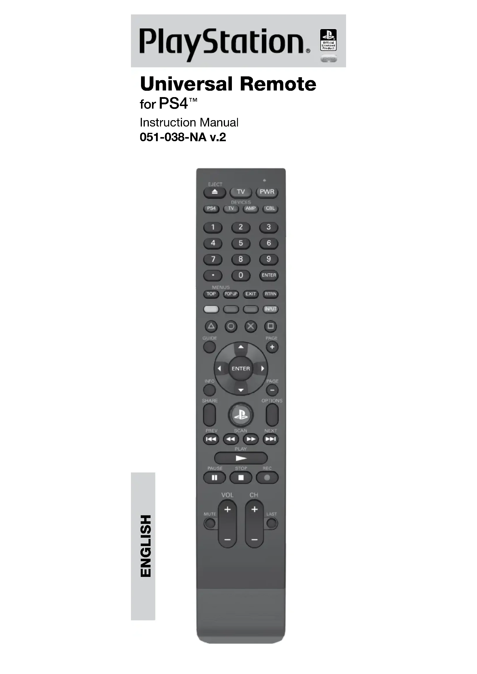 - La technologie infrarouge (IR) vous permet de faire fonctionner des appareils périphériques comme votre télévision, votre amplificateur audio/vidéo et votre décodeur câble/satellite. Pour utiliser l’infrarouge, vous devez diriger l’émetteur IR de la télécommande directement vers l’appareil. Vérifiez qu’il n’y a aucun obstacle entre la télécommande et l’appareil. Retirez le couvercle du compartiment des piles à l’arrière de la télécommande universelle puis insérez 2 piles AAA. Assurez-vous que les piles sont correctement orientées. Vériez la version du logiciel du système PS4