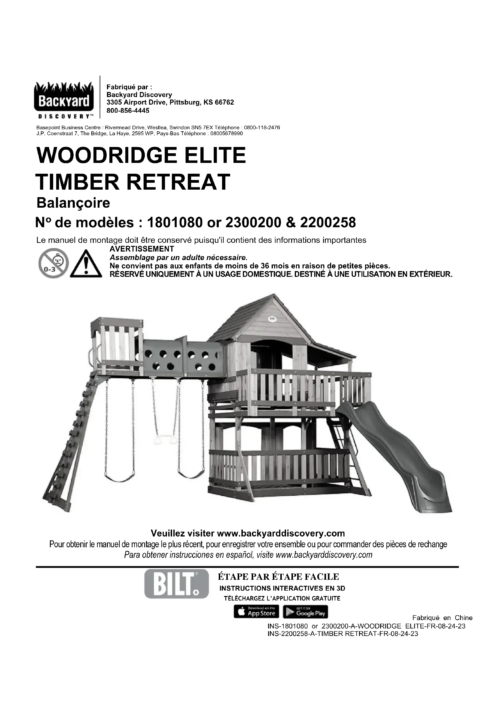 INSTRUCTIONS INTERACTIVES EN 3D TÉLÉCHARGEZ L’APPLICATION GRATUITE Veuillez visiter www.backyarddiscovery.com Pour obtenir le manuel de montage le plus récent, pour enregistrer votre ensemble ou pour commander des pièces de rechange Para obtener instrucciones en español, visite www.backyarddiscovery.com AVERTISSEMENT Assemblage par un adulte nécessaire. Ne convient pas aux enfants de moins de 36 mois en raison de petites pièces. RÉSERVÉ UNIQUEMENT À UN USAGE DOMESTIQUE. DESTINÉ À UNE UTILISATION EN EXTÉRIEUR. Fabriqué en Chine INS-1801080 or 2300200-A-WOODRIDGE ELITE-FR-08-24-23 INS-2200258-A-TIMBER RETREAT-FR-08-24-232 Manuel du propriétaire - Dimensions d’installation de base et notes relatives au montage Placez la balançoire sur un terrain plat, à au moins 2 m [6 pi - 7 po] de toute structure ou obstruction, telle qu’une clôture, un garage, une maison, des branches en surplomb, des cordes à linge ou des fils électriques.