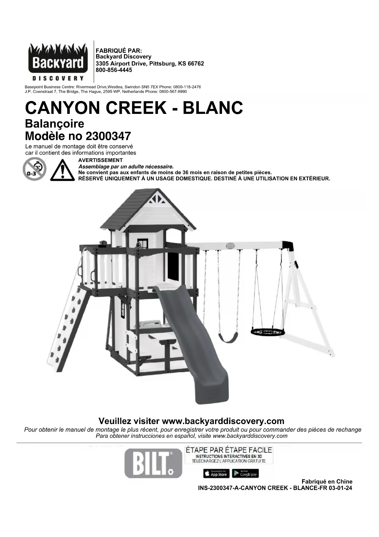 Balançoire Modèle no 2300347 Le manuel de montage doit être conservé car il contient des informations importantes AVERTISSEMENT Assemblage par un adulte nécessaire. Ne convient pas aux enfants de moins de 36 mois en raison de petites pièces. RÉSERVÉ UNIQUEMENT À UN USAGE DOMESTIQUE. DESTINÉ À UNE UTILISATION EN EXTÉRIEUR. Veuillez visiter www.backyarddiscovery.com Pour obtenir le manuel de montage le plus récent, pour enregistrer votre produit ou pour commander des pièces de rechange Para obtener instrucciones en español, visite www.backyarddiscovery.comZone de jeux sécuritaires HAUTEUR DE JEU SÉCURITAIRE: 16'-6 1/4" [5.0 m]HAUTEUR DE CHUTE MAXIMALE : 6'-4 1/2" [1.9 m]13'-4 1/4" [4.1 m] x 16'-4 1/4" [5.0 m]26'-6 1/4" [8.1 m] x 29'-6 1/4" [9.0 m] x 16'-6 1/4" [5.0 m]6'-4 1/2"[1.9 m]9'-11 1/4"[3.0 m]17'-1 1/4"[5.2 m]30'-3 1/4"[9.2 m]26'-6"[8.1 m]17'-1 1/4"[5.2 m]13'-4"[4.1 m]6'-7"[2.0 m]6'-7"[2.0 m] SCHÉMA DE LA ZONE DE JEU SÉCURITAIRE Manuel du propriétaire - Dimensions d’installation de base et notes relatives au montage Placez l’ensemble sur un terrain plat, à au moins 6 pi-7 po [2 m] de toute structure ou obstruction, comme une clôture, un garage, une maison, des branches en surplomb, des lignes de buanderie ou des fils électriques. Lors de l’assemblage de l’unité, prendre le temps avant et après chaque phase pour s’assurer fort est de niveau. Si le fort n’est pas de niveau, l’assemblage sera difficile et un mauvais assemblage pourrait en résulter. Il faut veiller à ce que le fort soit carré. L’aire de jeu sécuritaire désigne une zone qui s’étend de 6 pi à 7 po (2 m) au-delà du produit de jeu sur tous les côtés, y compris l’espace au- dessus du produit de jeu. Dimensions au sol Aire de jeux sécuritaire Informations générales : Votre ensemble de jeu a été conçu et étudié pour les enfants uniquement et pour un usage résidentiel uniquement. Un maximum de 150 lb par enfant est recommandé pour les activités de jeu conçues pour un usage individuel. Un maximum de 120 lb par enfant est recommandé pour les activités de jeu conçues pour plusieurs enfants. Le nombre maximum d’enfants recommandé pour cette balançoire est de 9.