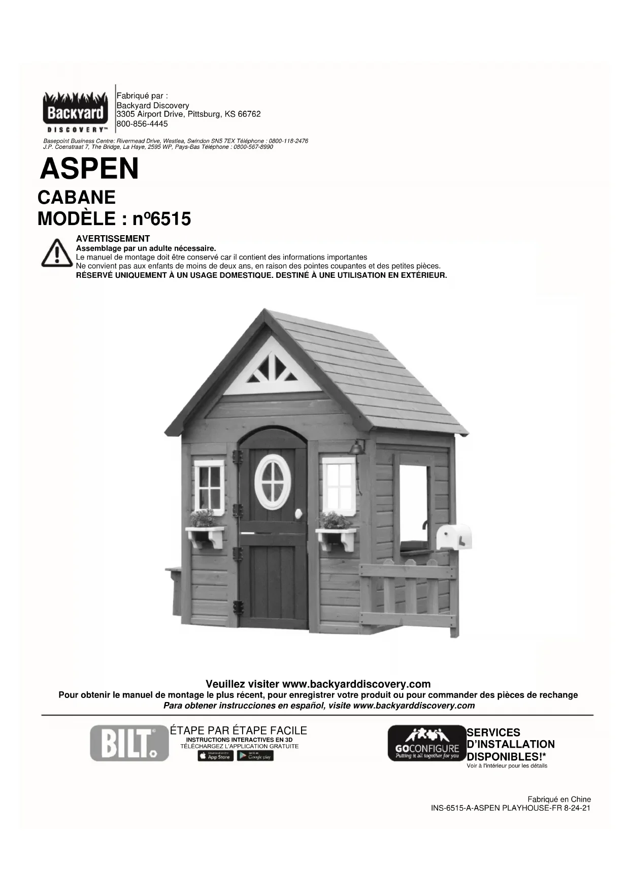 INSTRUCTIONS INTERACTIVES EN 3D TÉLÉCHARGEZ L’APPLICATION GRATUITE SERVICES D’INSTALLATION DISPONIBLES!* Voir à l'intérieur pour les détails Fabriqué en Chine INS-6515-A-ASPEN PLAYHOUSE-FR 8-24-21 AVERTISSEMENT Assemblage par un adulte nécessaire. Le manuel de montage doit être conservé car il contient des informations importantes Ne convient pas aux enfants de moins de deux ans, en raison des pointes coupantes et des petites pièces. RÉSERVÉ UNIQUEMENT À UN USAGE DOMESTIQUE. DESTINÉ À UNE UTILISATION EN EXTÉRIEUR. Veuillez visiter www.backyarddiscovery.com Pour obtenir le manuel de montage le plus récent, pour enregistrer votre produit ou pour commander des pièces de rechange Para obtener instrucciones en español, visite www.backyarddiscovery.comAvec Go Configure, nous vous offrons 18 ans d’expérience directement à votre porte. Nous proposons une vaste gamme de produits de loisirs intérieurs et extérieurs que la plupart des consommateurs n’ont ni le temps ni la capacité de fournir et d’installer eux-mêmes. C’est nous qui nous en chargeons, pour que vous n’ayez pas à le faire !