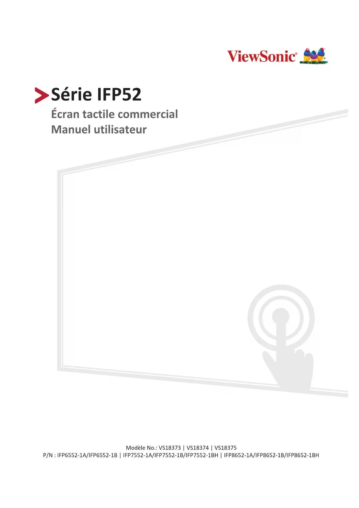 Série IFP52 Écran tactile commercial Manuel utilisateur Modèle No.: VS18373 | VS18374 | VS18375 P/N : IFP6552-1A/IFP6552-1B | IFP7552-1A/IFP7552-1B/IFP7552-1BH | IFP8652-1A/IFP8652-1B/IFP8652-1BH2 Merci d’avoir choisi ViewSonic® En tant que leader mondial de solutions visuelles, ViewSonic® se consacre à dépasser les attentes du monde en matière d’évolution technologique, d’innovation et de simplicité. Chez ViewSonic®, nous pensons que nos produits peuvent avoir un impact positif dans le monde et nous sommes convaincus que le produit ViewSonic® que vous avez choisi vous servira correctement. Une fois de plus, merci d’avoir choisi ViewSonic® !3 Précauons relaves à la sécurité Veuillez lire les Précauons de sécurité qui suivent avant de commencer à uliser l’appareil.