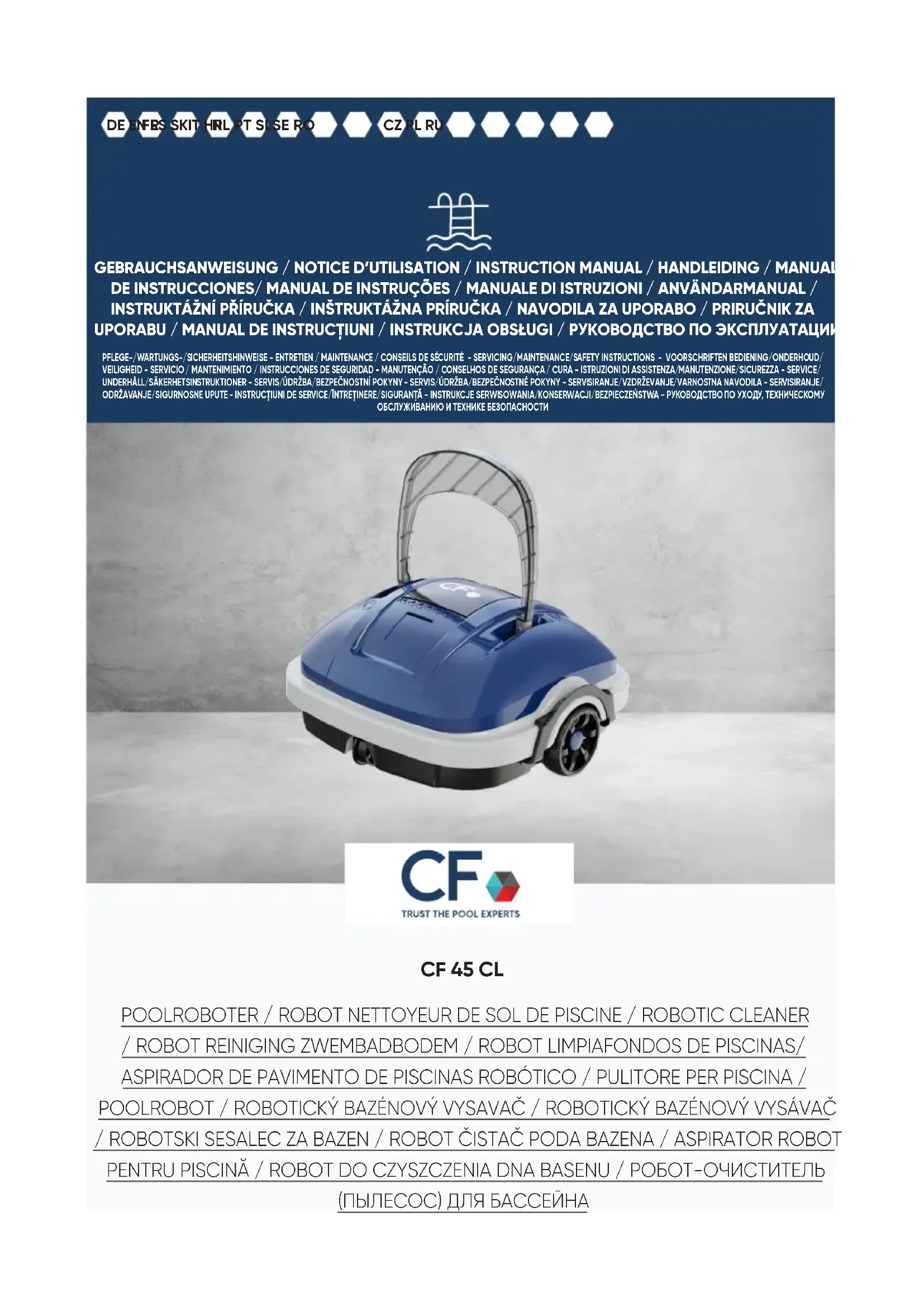SPÉCIFICATIONS DESCRIPTIF Nom du produit Robot Nettoyeur de Piscine Modèle CF 45 CL Tension de sortie nominale du chargeur 11,1V Puissance approx. 30W Cycle de travail max. 50min Tension d’entrée nominale de l’adaptateur 100Vac-240Vac Fréquence du chargeur 47Hz-63Hz Fréquence d’entrée nominale de l’adaptateur 1,8A/3A Tension de sortie nominale de l’adaptateur 12,6Vdc Courant de sortie nominale de l’adaptateur