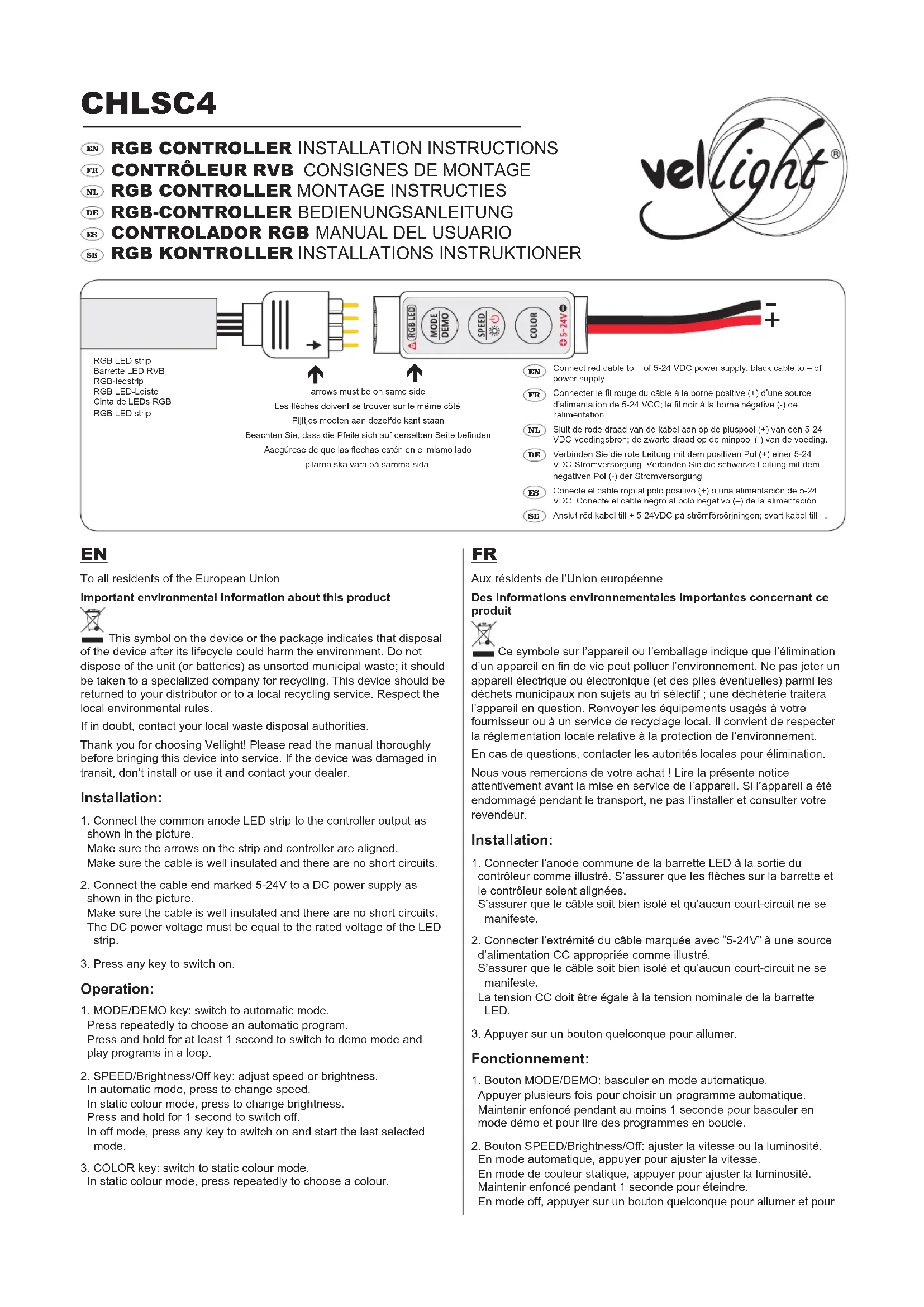 Aux résidents de l’Union européenneDes informations environnementales importantes concernant ce produit Ce symbole sur l’appareil ou l’emballage indique que l’élimination d’un appareil en n de vie peut polluer l’environnement. Ne pas jeter un appareil électrique ou électronique (et des piles éventuelles) parmi les déchets municipaux non sujets au tri sélectif ; une déchèterie traitera l’appareil en question. Renvoyer les équipements usagés à votre fournisseur ou à un service de recyclage local. Il convient de respecter la réglementation locale relative à la protection de l’environnement.En cas de questions, contacter les autorités locales pour élimination.Nous vous remercions de votre achat ! Lire la présente notice attentivement avant la mise en service de l’appareil. Si l’appareil a été endommagé pendant le transport, ne pas l’installer et consulter votre revendeur.Installation:1. Connecter l’anode commune de la barrette LED à la sortie du contrôleur comme illustré. S’assurer que les èches sur la barrette et le contrôleur soient alignées. S’assurer que le câble soit bien isolé et qu’aucun court-circuit ne se manifeste.2. Connecter l’extrémité du câble marquée avec “5-24V” à une source d’alimentation CC appropriée comme illustré. S’assurer que le câble soit bien isolé et qu’aucun court-circuit ne se manifeste. La tension CC doit être égale à la tension nominale de la barrette LED.3. Appuyer sur un bouton quelconque pour allumer.Fonctionnement:1. Bouton MODE/DEMO: basculer en mode automatique. Appuyer plusieurs fois pour choisir un programme automatique. Maintenir enfoncé pendant au moins 1 seconde pour basculer en mode démo et pour lire des programmes en boucle.2. Bouton SPEED/Brightness/Off: ajuster la vitesse ou la luminosité. En mode automatique, appuyer pour ajuster la vitesse. En mode de couleur statique, appuyer pour ajuster la luminosité. Maintenir enfoncé pendant 1 seconde pour éteindre. En mode off, appuyer sur un bouton quelconque pour allumer et pour RGB LED strip Barrette LED RVB RGB-ledstripRGB LED-LeisteCinta de LEDs RGBRGB LED striparrows must be on same sideLes èches doivent se trouver sur le même côtéPijltjes moeten aan dezelfde kant staanBeachten Sie, dass die Pfeile sich auf derselben Seite bendenAsegúrese de que las echas estén en el mismo ladopilarna ska vara på samma sidaConnect red cable to + of 5-24 VDC power supply; black cable to – of power supply.Connecter le l rouge du câble à la borne positive (+) d’une source d’alimentation de 5-24 VCC; le l noir à la borne négative (-) de l’alimentation.Sluit de rode draad van de kabel aan op de pluspool (+) van een 5-24 VDC-voedingsbron; de zwarte draad op de minpool (-) van de voeding.Verbinden Sie die rote Leitung mit dem positiven Pol (+) einer 5-24 VDC-Stromversorgung. Verbinden Sie die schwarze Leitung mit dem negativen Pol (-) der Stromversorgung.Conecte el cable rojo al polo positivo (+) o una alimentación de 5-24 VDC. Conecte el cable negro al polo negativo (–) de la alimentación.Anslut röd kabel till + 5-24VDC på strömförsörjningen; svart kabel till –.