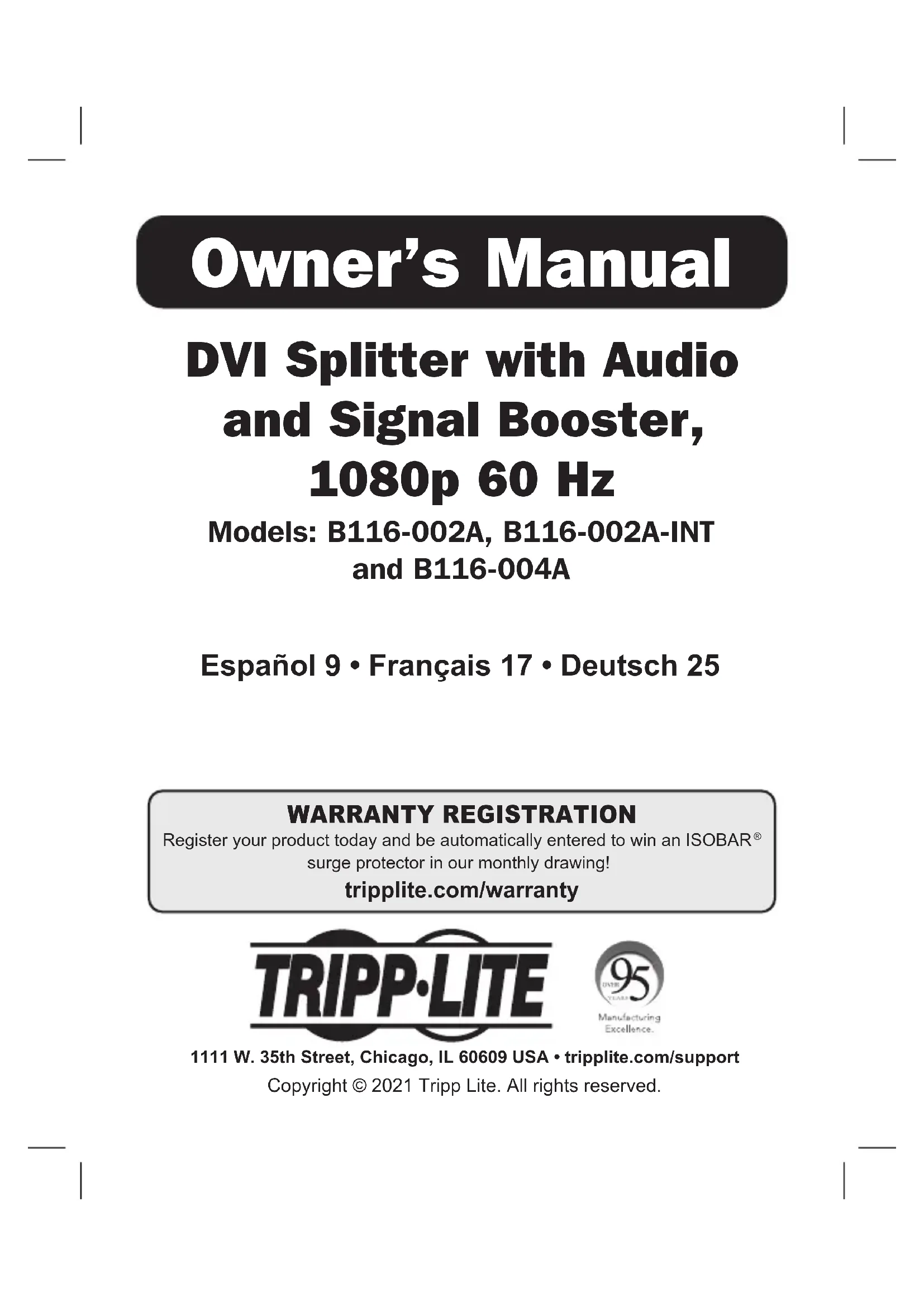 - D'envoyer le vieil équipement au recyclage en autant qu'il remplace un équipement équivalent (cela varie selon les pays) La politique de Tripp Lite en est une d'amélioration continue. Les caractéristiques techniques sont modifiables sans préavis. Les produits réels peuvent différer légèrement des photos et des illustrations. 1111 W. 35th Street, Chicago, IL 60609 USA • tripplite.com/support 21-08-071 93-38AD_RevB25 DVI-Splitter mit Audio- und Signalverstärker, 1080p 60 Hz Modelle: B116-002A, B116-002A-INT und B116-004A 1111 W. 35th Street, Chicago, IL 60609 USA • tripplite.com/support Copyright © 2021 Tripp Lite. Alle Rechte vorbehalten. English 1 • Español 9 • Français 17 Bedienungsanleitung26