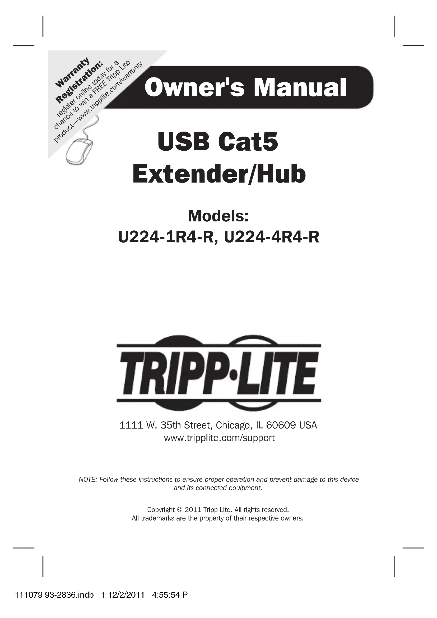 Extendeur/ Concentrateur USB Cat5 Modèles : U224-1R4-R, U224-4R4-R 1111 W. 35th Street, Chicago, IL 60609 USA www.tripplite.com/support REMARQUE : Suivez ces instructions pour assurer une bonne performance et éviter l’endommagement de cet appareil et des périphériques qui lui sont raccordés. Droits d’auteur (md) 2011 Tripp Lite. Tous droits réservés. Toutes les marques commerciales sont la propriété de leurs titulaires respectifs. Manuel du propriétaire 201111079 93-2836.indb 17 12/2/2011 4:55:55 PMContenu de l’emballage 19 Accessoires en option 19 Définition produit 19 Installation 20 Dépannage 22 Garantie 23 English 1 Español 9