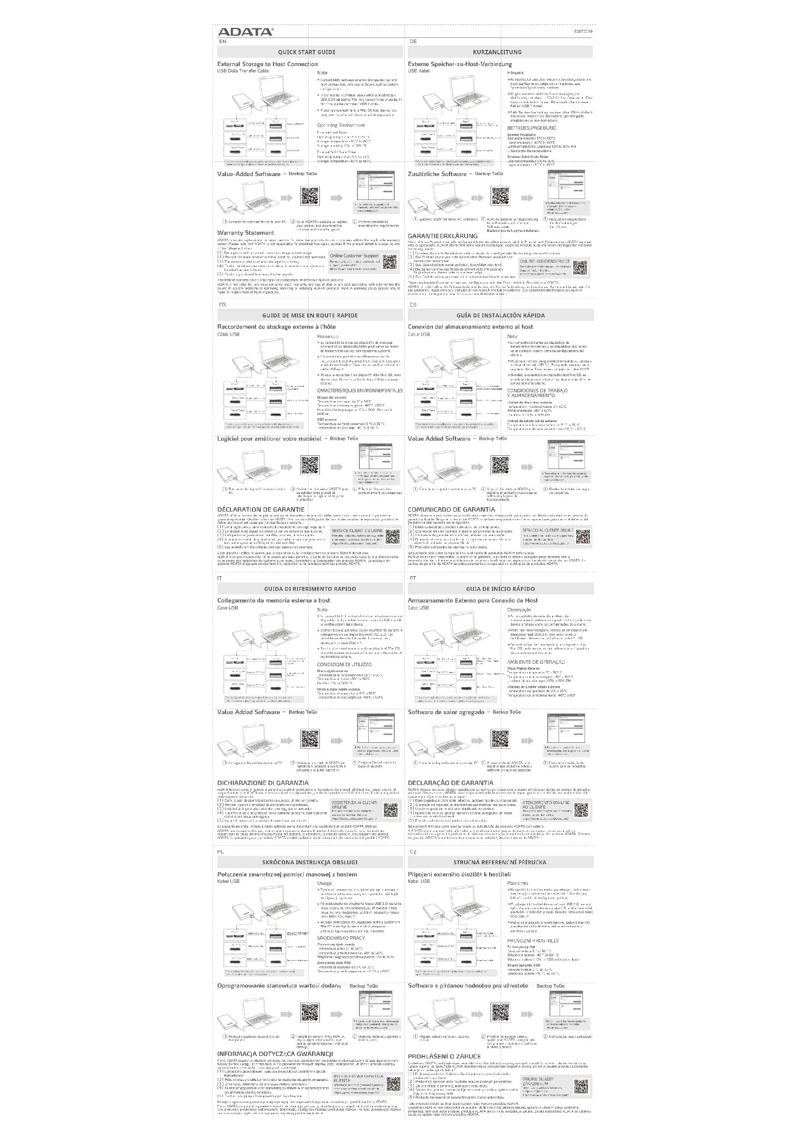 ADATA offre un service de remplacement ou de réparation des produits défectueux à nos clients durant la période de garantie applicable. Veuillez noter que ADATA n'est pas dans l'obligation de fournir des services de réparation gratuits si le défaut du produit est causé par l'un des facteurs suivants: ( 1 ) Dommages causés par une catastrophe naturelle ou un usage inapproprié. ( 2 ) Le produit a été réparé ou démonté par un personnel non autorisé. ( 3 ) L'étiquette de garantie est modifiée, abîmée, ou manquante. ( 4 ) Le numéro de série du produit n'est pas conforme aux enregistrements dans notre système ou l'étiquette a été modifiée. ( 5 ) Les produits ont été achetés chez des agents non autorisés. Cette garantie limitée ne couvre que la réparation ou le remplacement de produits ADATA défectueux. ADATA n'est pas responsable, et ne couvre pas sous garantie, la perte de données ou les coûts associés à la détermination de la source des problèmes du système ou le retrait, l'entretient ou l'installation des produits ADATA. La politique de garantie ADATA s'applique uniquement à la réparation ou le remplacement des produits ADATA.Micro-BCâble Micro B vers ADisque dur externe /SSD externeExternes Solid State DriveExterne FestplatteType-AType-C Type-AType-C Type-CCâble USB-C vers ACâble USB-C vers C*Pour plus de détails sur les spécifications de chaque câble, veuillez consulter les informations sur leur emballage respectif. Raccordez le dispositif externe à votre
