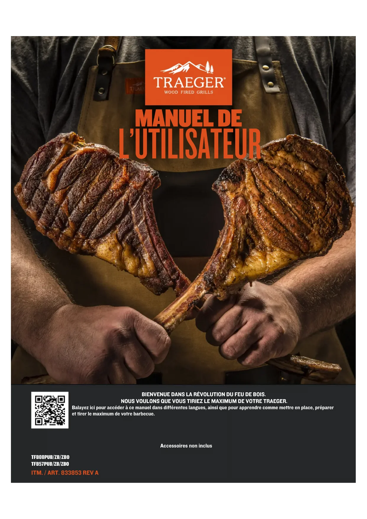Accessoires non inclus BIENVENUE DANS LA RÉVOLUTION DU FEU DE BOIS. NOUS VOULONS QUE VOUS TIRIEZ LE MAXIMUM DE VOTRE TRAEGER. Balayez ici pour accéder à ce manuel dans diérentes langues, ainsi que pour apprendre comme mettre en place, préparer et tirer le maximum de votre barbecue.2 45,7 cm (18po)45,7 cm (18po) LE FAIT DE NE PAS MAINTENIR LES ESPACEMENTS REQUIS ENTRE LES MATÉRIAUX COMBUSTIBLES EST UNE DES CAUSES MAJEURES D’INCENDIES. IL EST EXTRÊMEMENT IMPORTANT QUE CE PRODUIT SOIT INSTALLÉ CONFORMÉMENT À CES INSTRUCTIONS. Lorsque vous utilisez et entretenez votre barbecue Traeger