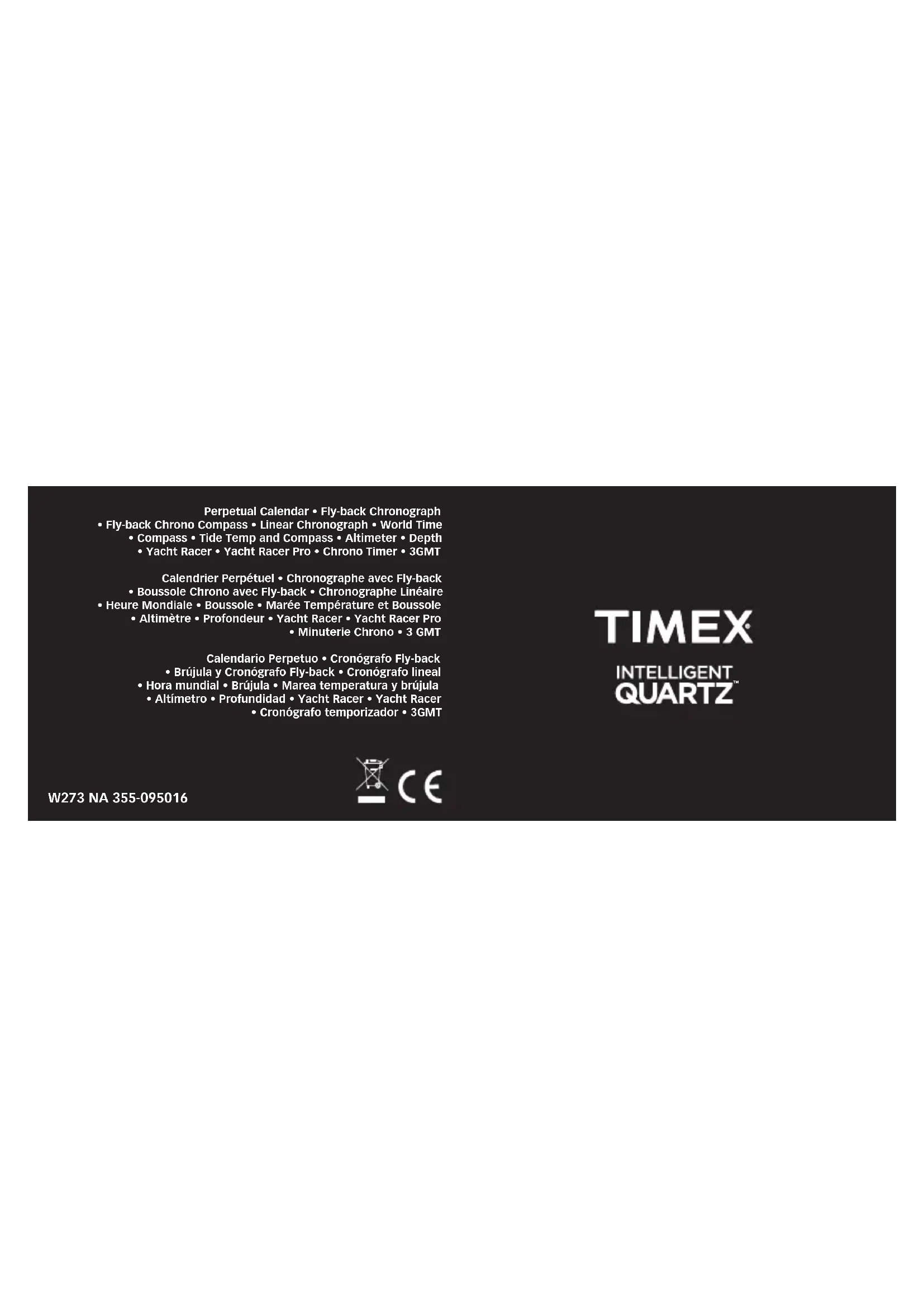 doit être réparée, envoyez-la à Timex conformément aux dispositions de la Garantie internationale Timex ou adressez-le à : TG SERVICE CENTER, P.O. Box 2740, Little Rock, AR 72203. Pour toute question concernant les réparations, appelez le 1-800- 328-2677 ou envoyez un courriel à custserv@timex.com GARANTIE ÉTENDUE Disponible aux É.-U. exclusivement. La garantie peut être prolongée pour une période additionnelle de 4 ans à compter de la date d’achat pour la somme de 5 $. Vous pouvez effectuer ce paiement avec AMEX, Discover, Visa ou MasterCard en composant le 1 800-800-448-4639 durant les heures normales d’ouverture. Le paiement doit être effectué dans les 30 jours qui suivent l’achat. Indiquer les nom, adresse, numéro de téléphone, date d’achat et numéro de modèle à 5 chiffres. Il est égale- ment possible d’envoyer un chèque de 5 $ US par courrier à : Timex Extended Warranty, P.O. Box 1676, Dept. EF, Little Rock, AR 72203. ©2015 Timex Group USA, Inc. TIMEX, INDIGLO, et INTELLIGENT QUARTZ sont des marques déposées de Timex Group B.V. et de ses filiales.259 RELOJES TIMEX