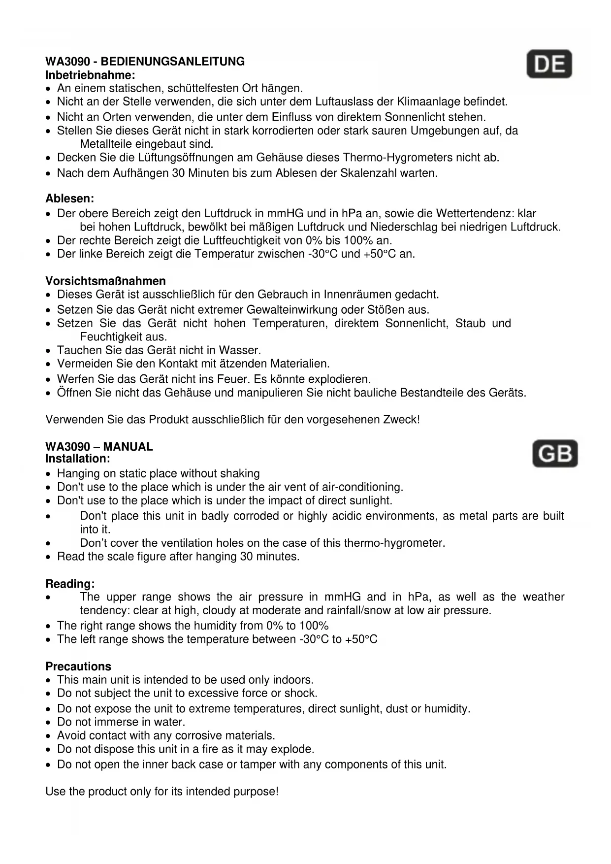 WA 3090 - Thermomètre Techno Line - Notice d'utilisation et mode d'emploi gratuit