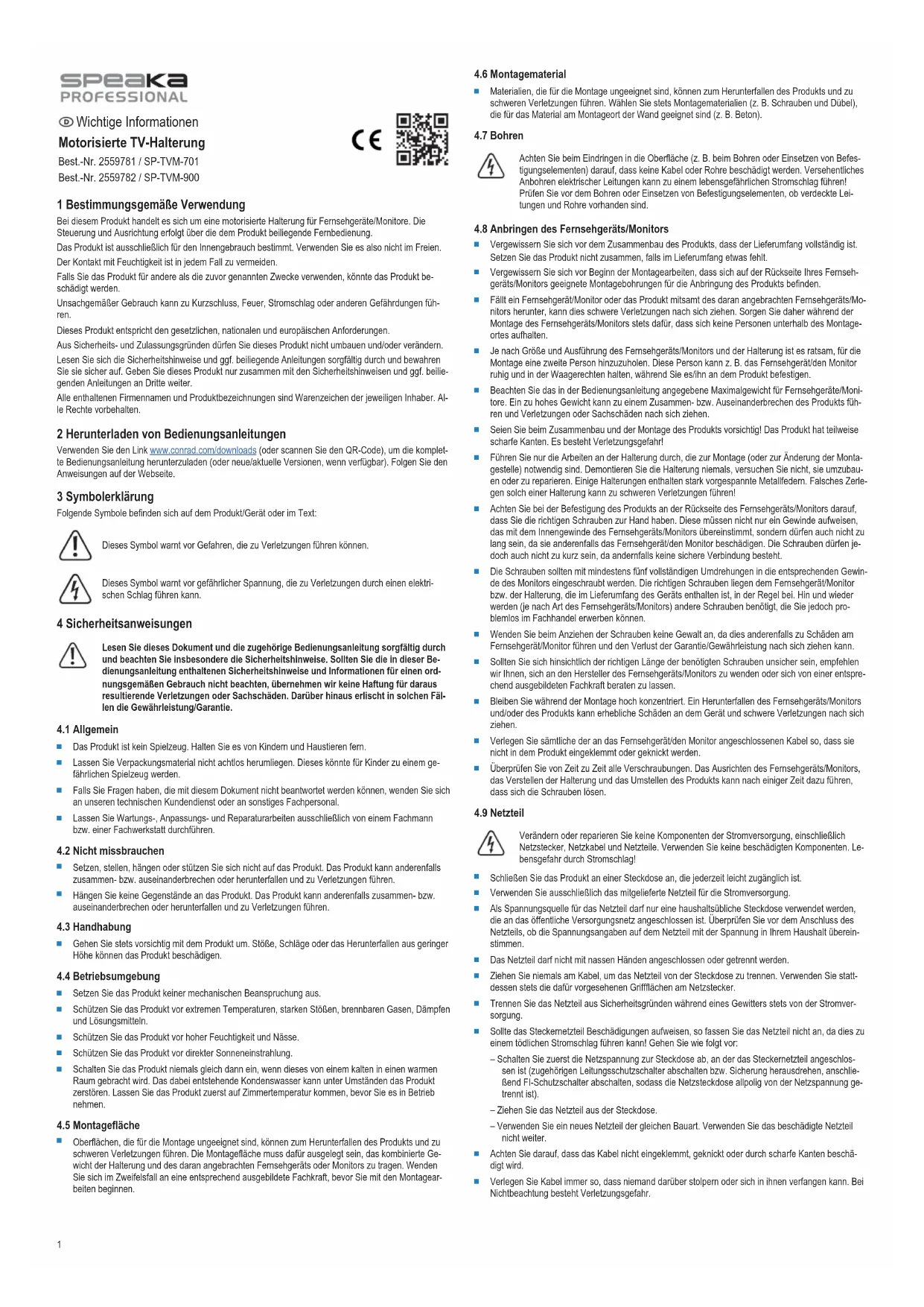 Dimensions (W x H x D) (approx.) ......... Item no.: 2559781: 1220 x 430 x 56 mm Item no.: 2559782: 650 x 559 x 485 mm Weight (approx.) .................................... Item no.: 2559781: 7.1 kg (without accessories) Item no.: 2559782: 10.8 kg (without accessories) This is a publication by Conrad Electronic SE, Klaus-Conrad-Str. 1, D-92240 Hirschau (www.conrad.com). All rights including translation reserved. Reproduction by any method (e.g. photocopying, microfilming or the capture in electronic data processing systems) requires prior written approval from the editor. Reprinting, also in part, is prohibited. This publication reflects the technical status at the time of printing. Copyright by Conrad Electronic SE. *2559781_2559782_V4_1223_dh_ss_en 27021598306831499-2 I4/O4 en5 Informations importantes Support TV motorisé N° de commande 2559781 / SP-TVM-701 N° de commande 2559782 / SP-TVM-900 1 Utilisation conforme Le produit est un support de téléviseur/moniteur motorisé. Utilisez la télécommande fournie pour le ré- glage de la position. Le produit est destiné uniquement à une utilisation à l’intérieur. Ne l'utilisez pas à l’extérieur. Dans tous les cas, le contact avec l’humidité doit être évité. Toute utilisation à des fins autres que celles décrites pourrait endommager le produit. Une mauvaise utilisation peut entraîner des risques tels que des courts-circuits, des incendies, des chocs électriques, etc. Ce produit est conforme aux exigences nationales et européennes en vigueur. Pour des raisons de sécurité et d’homologation, toute restructuration et/ou modification du produit est in- terdite. Lisez attentivement les consignes de sécurité et toutes les instructions qui les accompagnent et rangez- les dans un endroit sûr. Ne mettez ce produit à la disposition de tiers qu'avec les consignes de sécurité et les éventuelles instructions qui les accompagnent. Tous les noms d’entreprises et appellations de produits sont des marques commerciales de leurs proprié- taires respectifs. Tous droits réservés. 2 Mode d'emploi à télécharger Utilisez le lien www.conrad.com/downloads (ou scannez le code QR) pour télécharger le mode d'emploi complet (ou les versions nouvelles/actuelles, le cas échéant). Respectez les instructions indiquées sur la page Web. 3 Description des symboles Les symboles suivants figurent sur le produit/appareil ou sont utilisés dans le texte: Le symbole met en garde contre les dangers pouvant entraîner des blessures corporelles. Le symbole attire l’attention sur la présence d'une tension dangereuse pouvant entraîner des blessures par choc électrique. 4 Consignes de sécurité Lisez attentivement ce document ainsi que les instructions d’utilisation qui l’accom- pagnent et respectez en particulier les consignes de sécurité. Nous ne saurions être tenus pour responsables des blessures corporelles ou des dommages matériels ré- sultant du non-respect des mises en garde et des indications relatives à une utilisa- tion correcte figurant dans ce mode d'emploi. De tels cas entraînent l’annulation de la garantie.