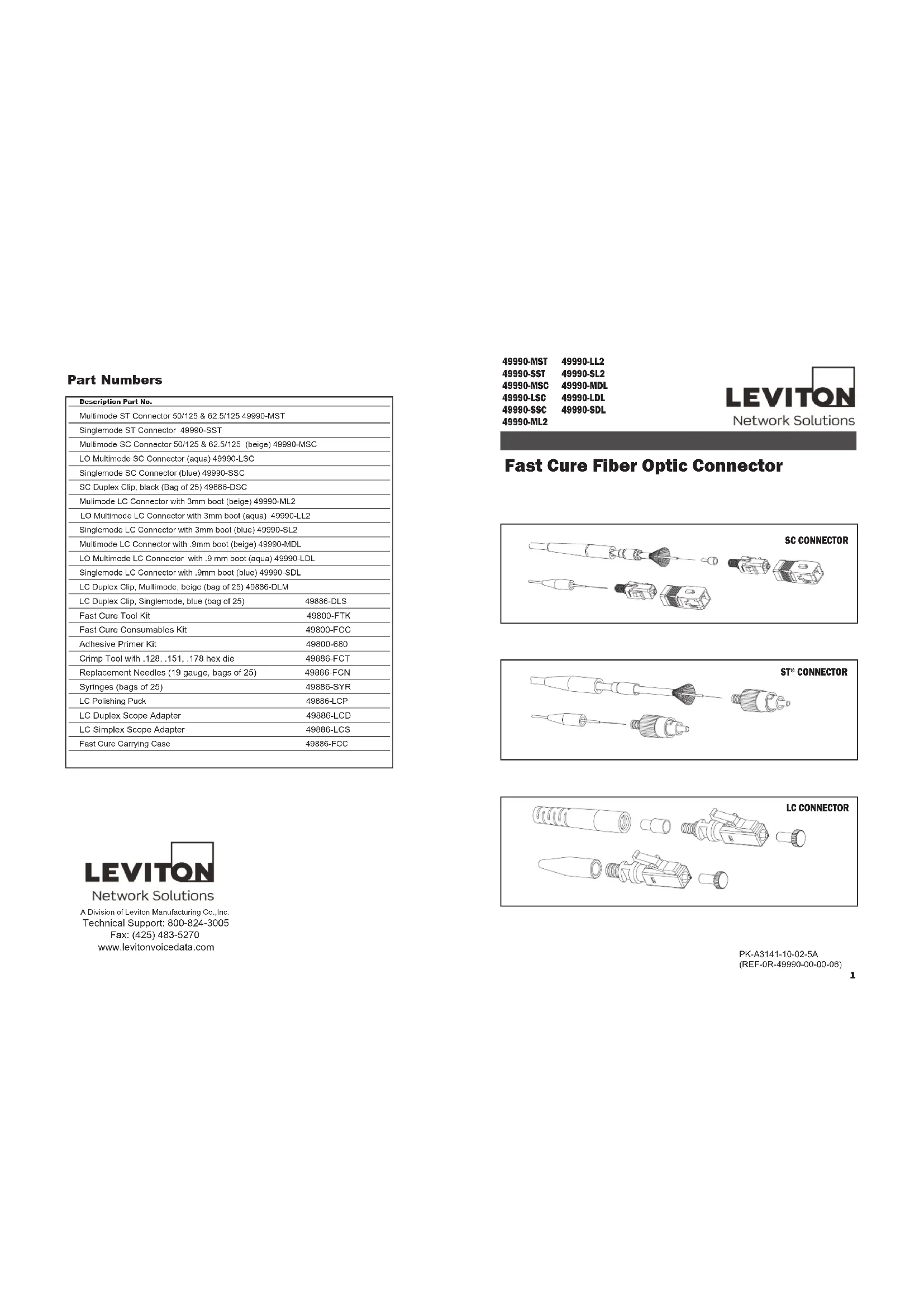 1. Il est important de nettoyer souvent la gaine et la fibreexposée au moyen d’une solution isopropylique afin des’assurer que cette dernière soit exempte de toutepoussière, particule ou substance huileuse.2. Ne pas déposer le capuchon pare-poussière de la ferrulesur une surface sale ou poussiéreuse.3. Lorsqu’on utilise des outils de serrage, insérer leconnecteur dans l’outil avant d’insérer la fibre dans leconnecteur.4. Afin de s’assurer de conserver la courbure de l’extrémitéde la fibre, utiliser le tampon ainsi que la rondelle et lapellicule de polissage de Leviton conformément auxdirectives décrites à la section relative au polissage(section C, page 9).#"!$ !(Connecteur ST multimode, 50/125 et 62,5/125 µm 49990-MSTConnecteur ST monomode 49990-SSTConnecteur SC multimode, 50/125 et 62,5/125 µm (beige) 49990-MSCConnecteur SC multimode, 50/125 LOMM (aqua) 49990-LCSConnecteur SC monomode (bleu) 49990-SSCAgrafes SC doubles, noires (sac de 25) 49886-DSCConnecteur LC multimode, fourreaux de 2 et de 3 mm (beige) 49990-ML2Connecteur LC LO multimode, fourreaux de 2 et de 3 mm (aqua) 49990-LL2Connecteur LC monomode, fourreaux de 2 et de 3 mm (bleu) 49990-SL2Connecteur LC multimode, fourreau de 0,9 mm (beige) 49990-MDLConnecteur LC LO multimode, fourreau de 0,9 mm (aqua) 49990-LDLConnecteur LC monomode, fourreau de 0,9 mm (bleu) 49990-SDLAgrafes LC doubles, multimodes, beiges (sac de 25) 49886-DLMAgrafes LC doubles, monomodes, bleues (sac de 25) 49886-DLSTrousse d’outils Fast-Cure 49800-FTKTrousse de consommables Fast-Cure 49800-FCCTrousse d’adhésif et de primaire 49800-680Sertisseur, encoches hexagonales (0,128, 0,151 et 0,178) 49800-FCTAiguilles de rechange (calibre 19, sac de 25) 49800-FCNSeringues (sac de 25) 49800-SYRRondelle de polissage LC 49886-LCPAdaptateur doubles de lunette d’inspection (LC) 49886-LCDAdaptateur de lunette d’inspection (LC) 49886-LCSTrousse de consommables Fast Cure 49800-FCC
