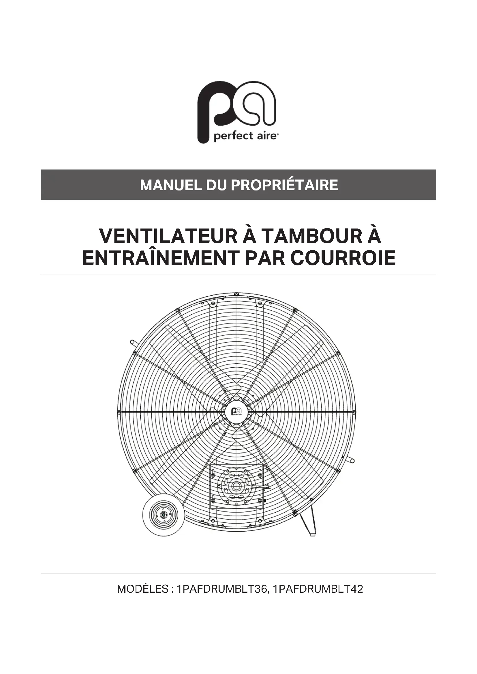 | Caractéristiques techniques | Ventilateur Perfect Aire 1PAFDRUMBLT42, puissance de 42 pouces, moteur à courant alternatif, plusieurs vitesses de ventilation. |