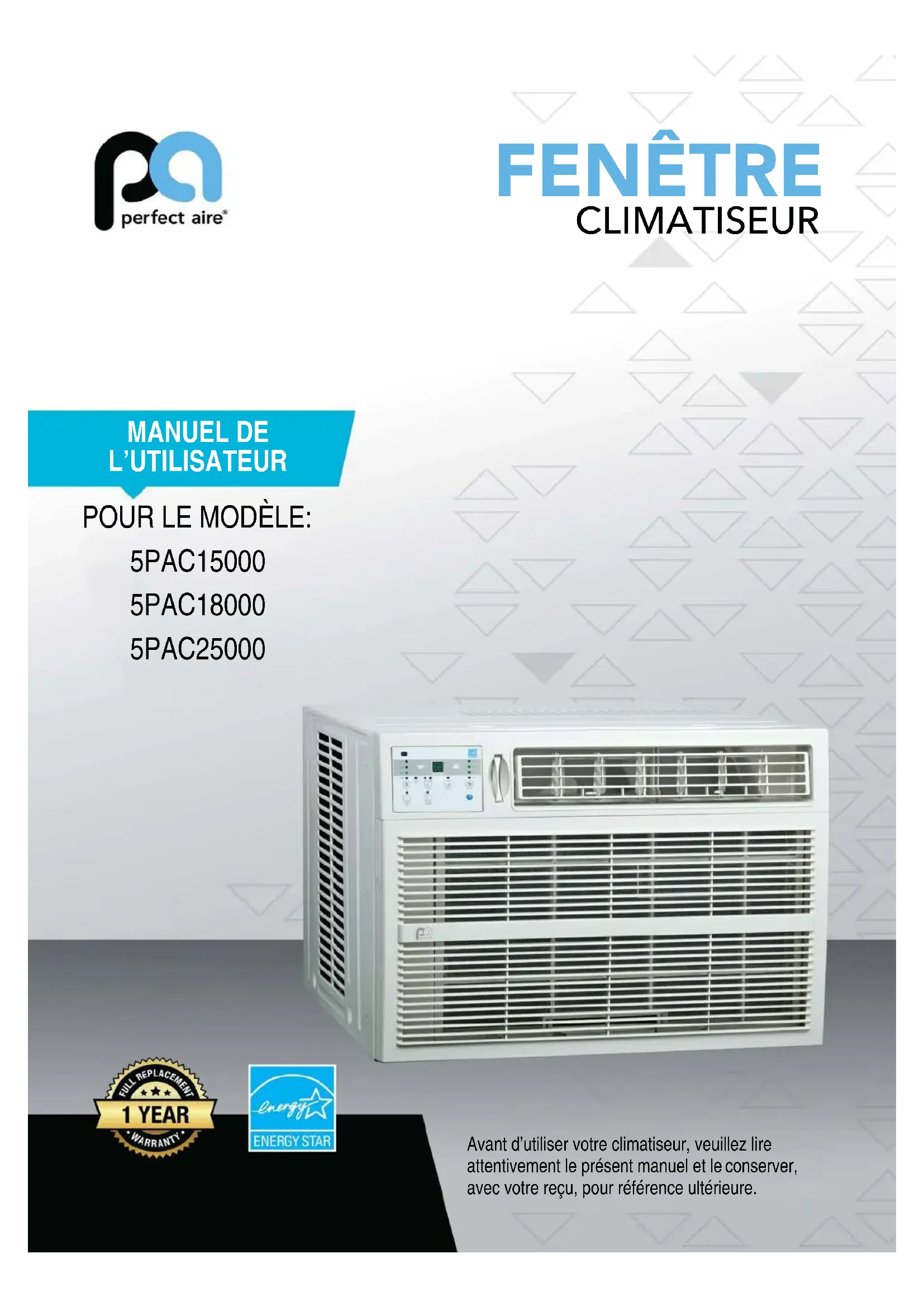Avant d’utiliser votre climatiseur, veuillez lire attentivement le présent manuel et le conserver, avec votre reçu, pour référence ultérieure. MANUEL DE L’UTILISATEUR POUR LE MODÈLE: 5PAC15000 5PAC18000 5PAC25000 FENÊTRE